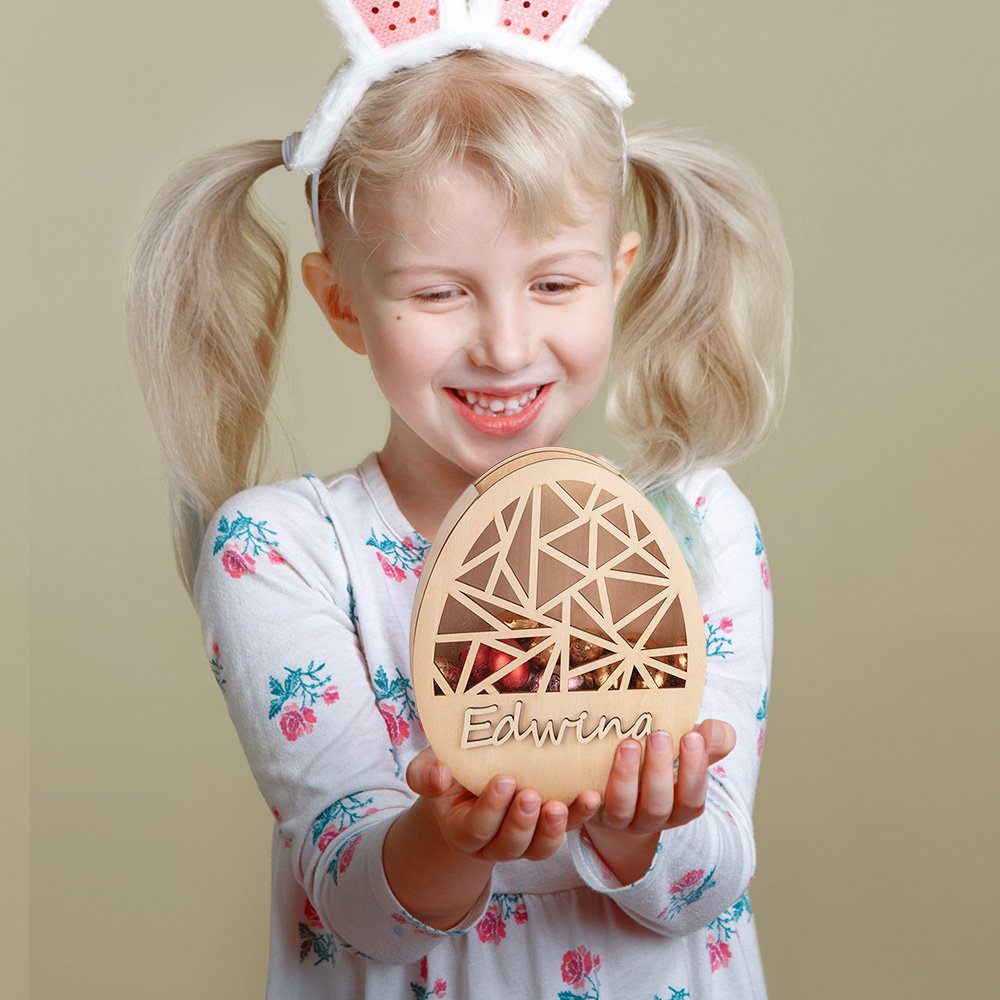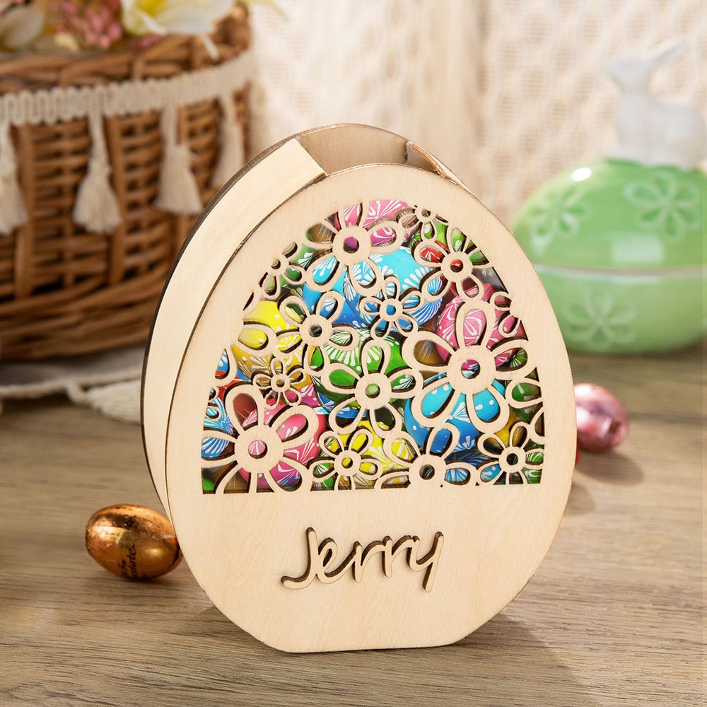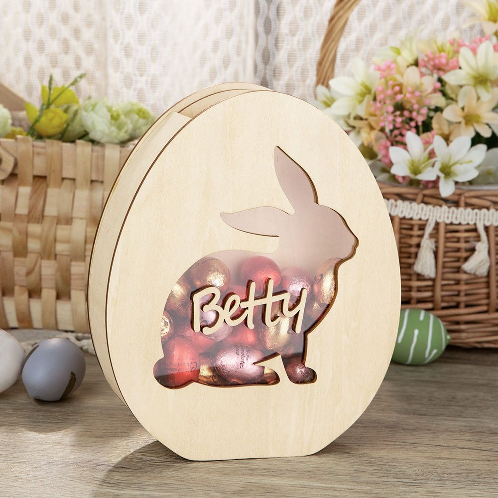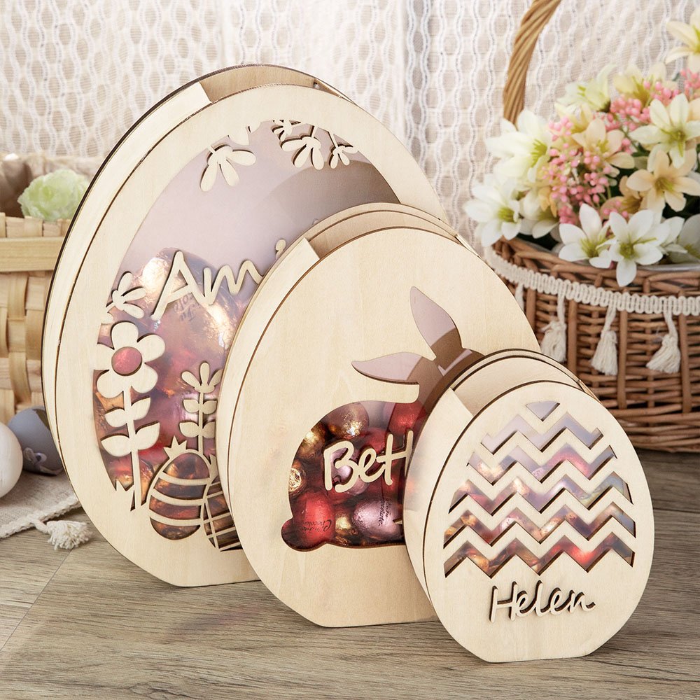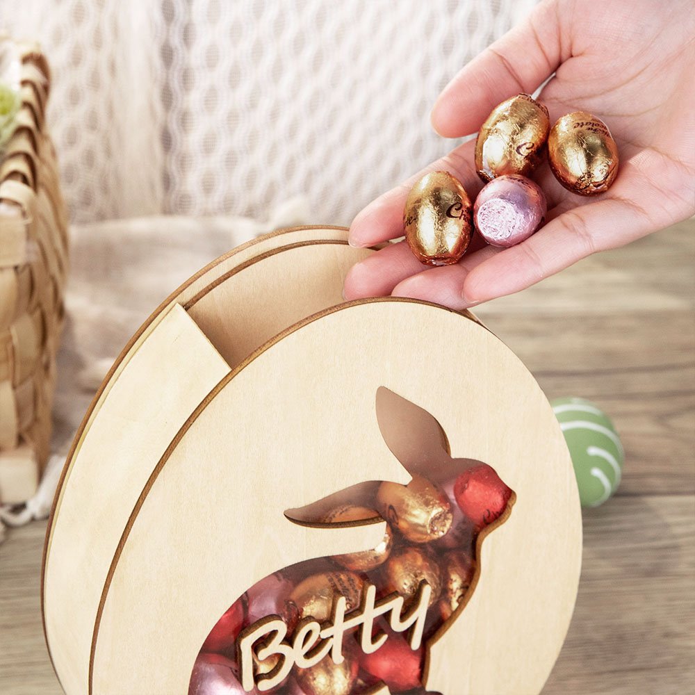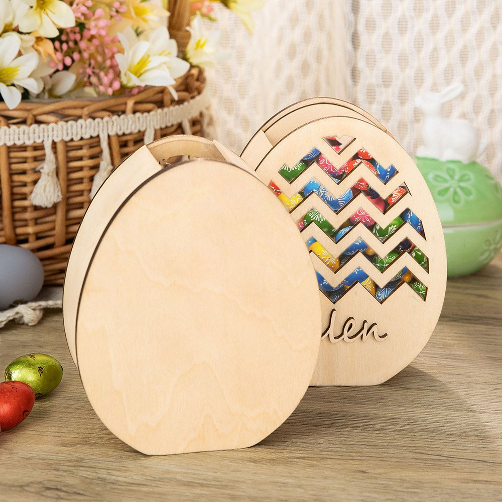 Valmistettu puusta, kestävästä ja uudelleenkäytettävästä materiaalista, jota voit käyttää pitkään. Näitä voi käyttää vuodesta toiseen täyttämään minipääsiäismunia, suklaata ja karkkia tai käyttää rahapurkkina loppuvuoden ajan. Pieni reikä yläreunassa mahdollistaa munien helpon pudottamisen sisään tai ottamisen ulos.