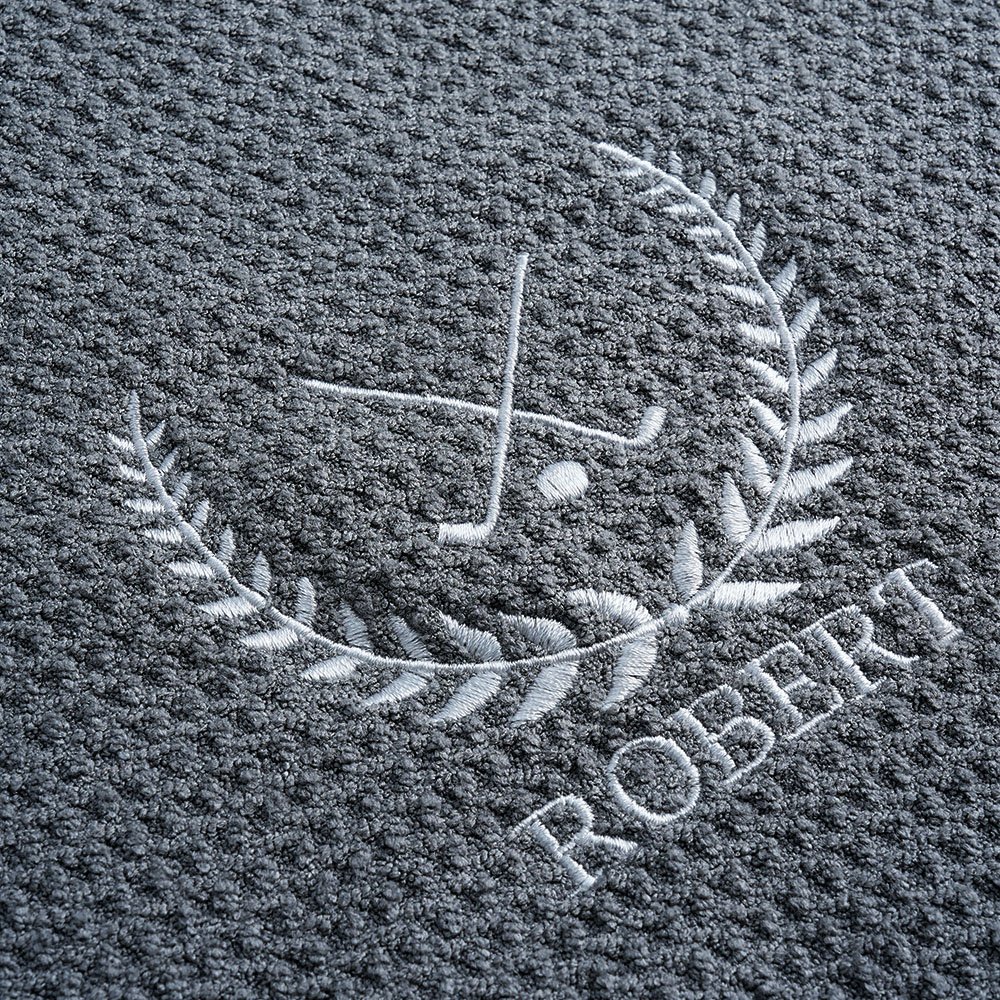 Mukauta pyyhe nimikirjaimilla nimellä tai lyhyellä viestillä tyylikkäästi kirjailtuina. Valitse yhdeksästä silmäänpistävästä kuviosta kuten liekistä tai golfaiheista jotka sopivat täydellisesti jokaisen golfarin tyyliin.