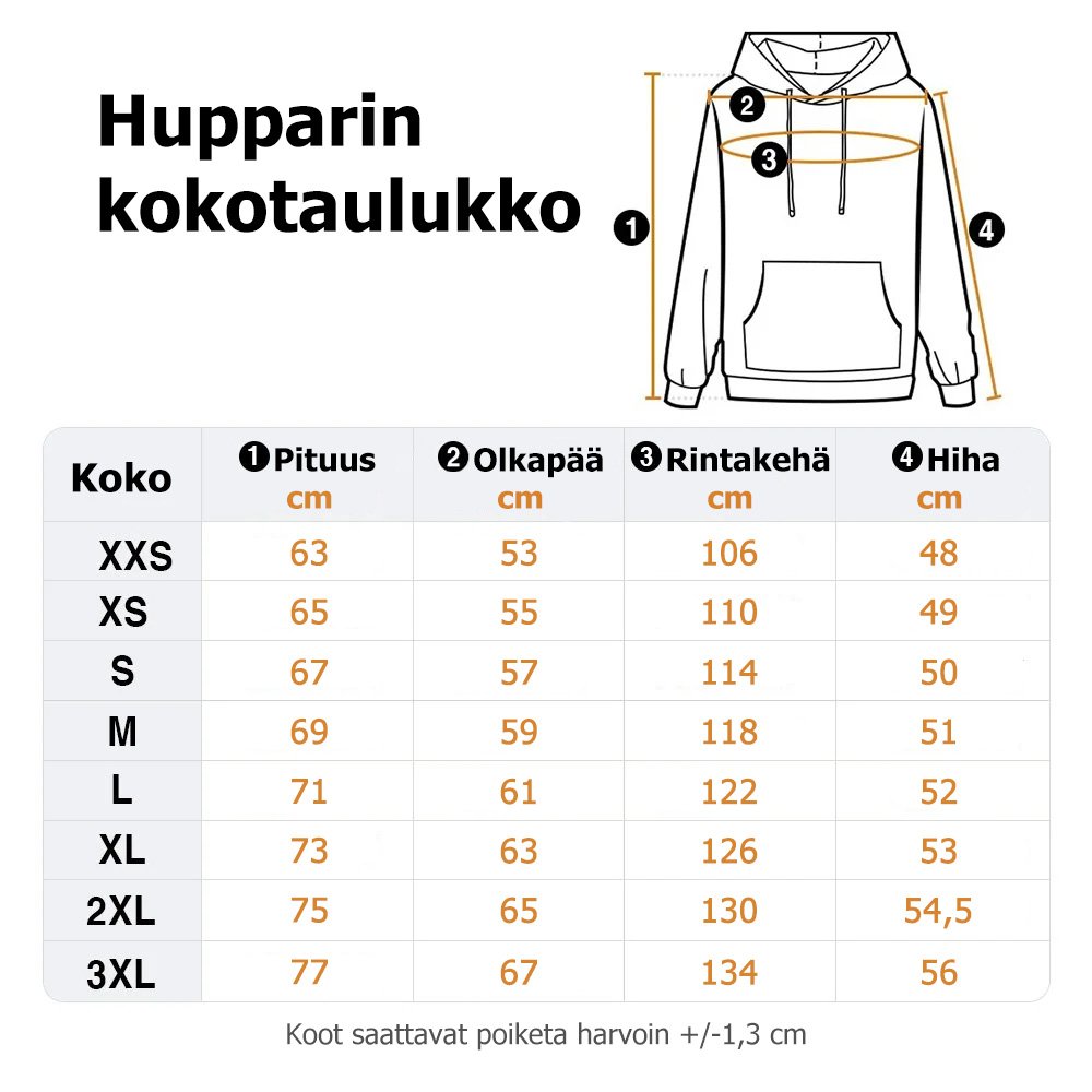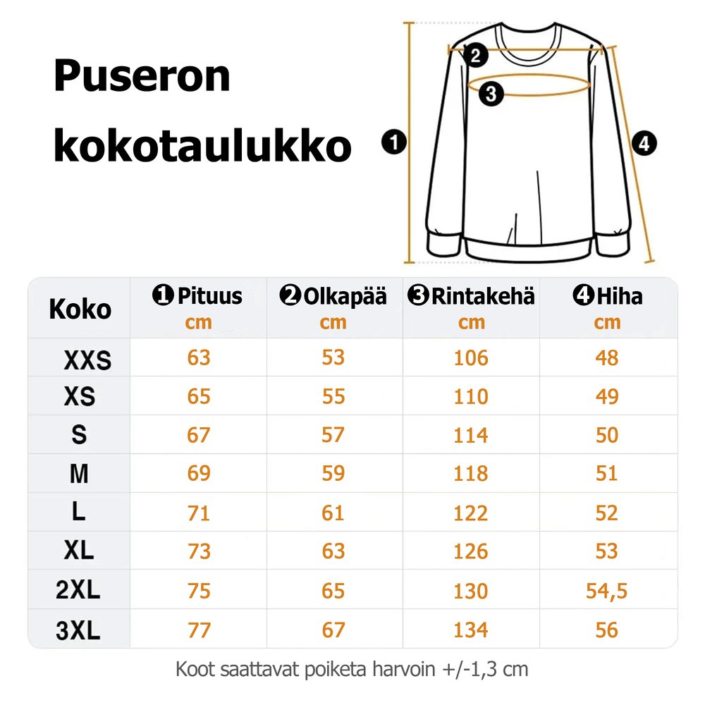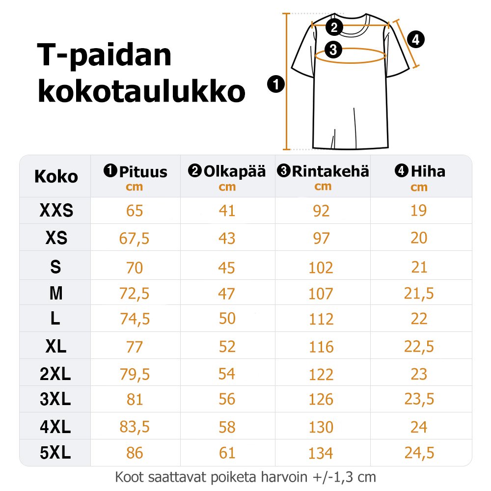 | Mittaus: | T-paita - XXS, XS, S, M, L, XL, 2XL, 3XL, 4XL, 5XL, 5XL Pusero - XXS, XS, S, M, L, XL, XL, 2XL, 3XL Huppari - XXS, XS, S, M, L, XL, XXL, 3XL |