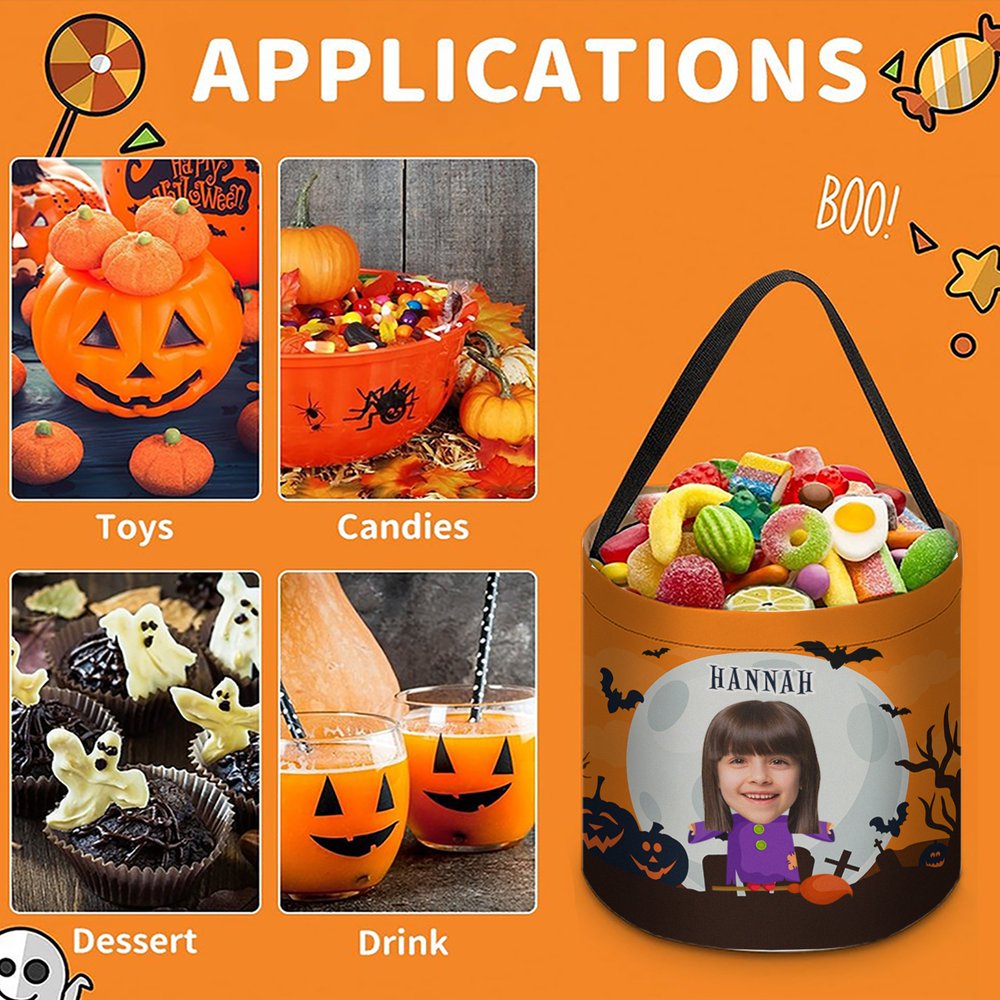 Yhdistä mukautetut valokuvat Halloween-asuun (18 valinnaista) - ainutlaatuinen muotoilu on täynnä juhlatunnelmaa. Valitse 4 väriä, kuten vihreä, violetti, muokkaa nimiä, ja tee karkkipussista lapsille yksinoikeudella Halloween-elementtejä, kuten jätkälyhtyjä, lepakoita, ja keskity maksimoimaan juhlallinen hauskuus.