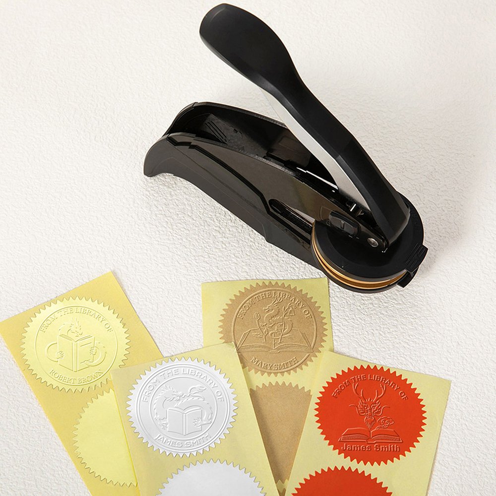 | Mittaus: | Embosser - 4.72" × 4.41" × 0.91'' (12cm × 11.2cm × 2.3cm); Pyöreän sinetin halkaisija - 1.57" (4cm); Foliotarran halkaisija - 1.65" (4cm) |