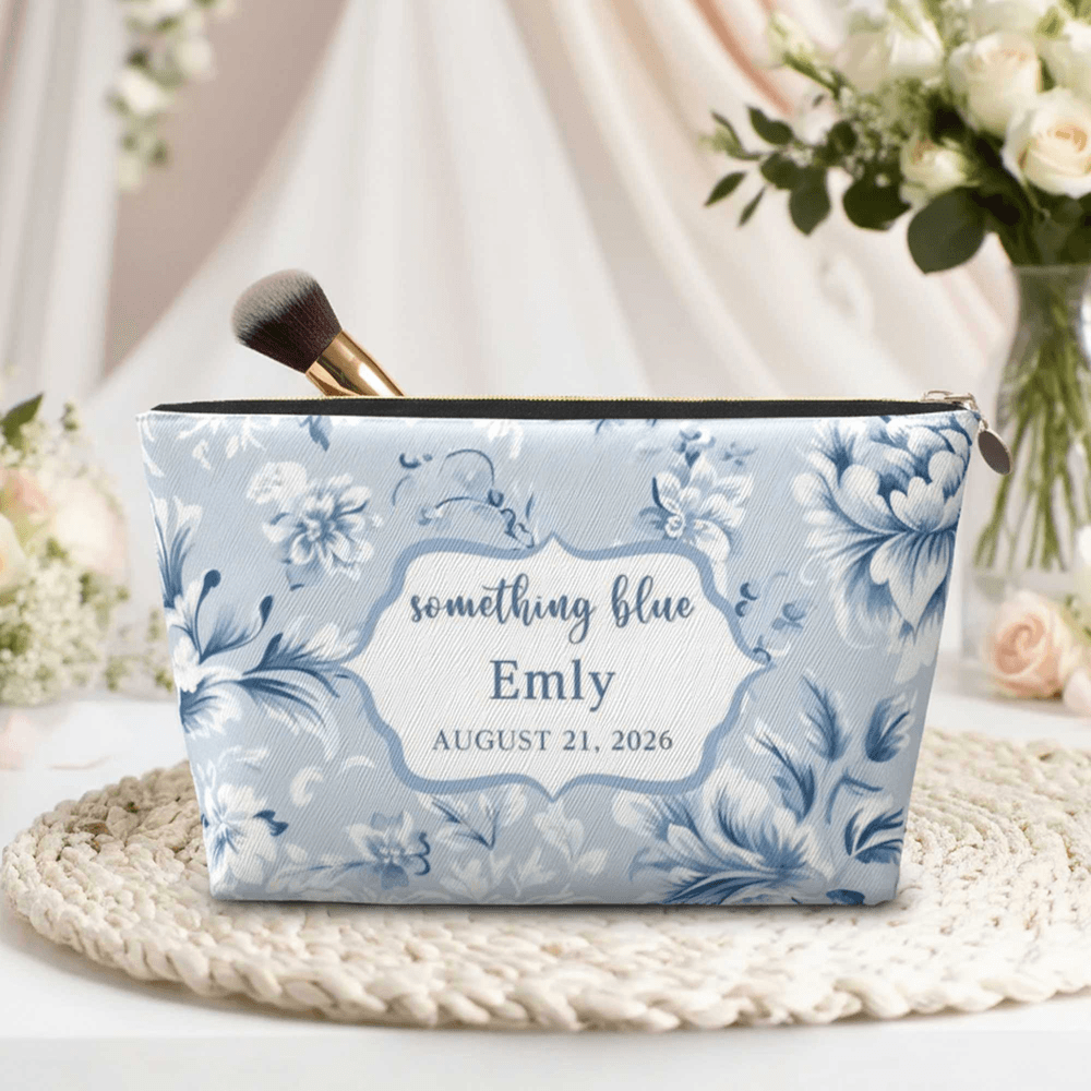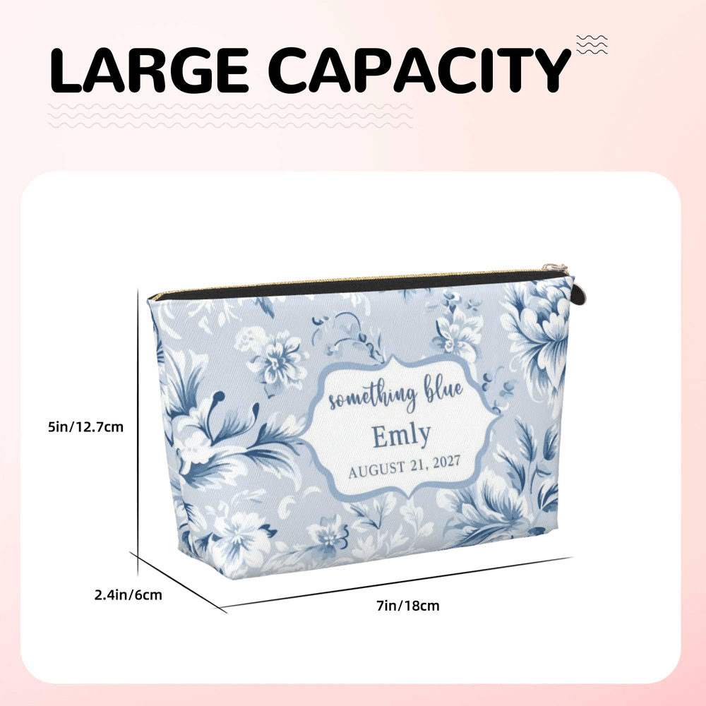 Tässä meikkipussissa on sinisiä kukkakuvioita, ja se voidaan personoida omalla nimellä ja erityisellä päivämäärällä. Herkkä muotoilu yhdistää pehmeän kauneuden ja ainutlaatuisen tunteen, mikä luo todella ainutlaatuisen lisävarusteen, joka on täynnä lämpöä.