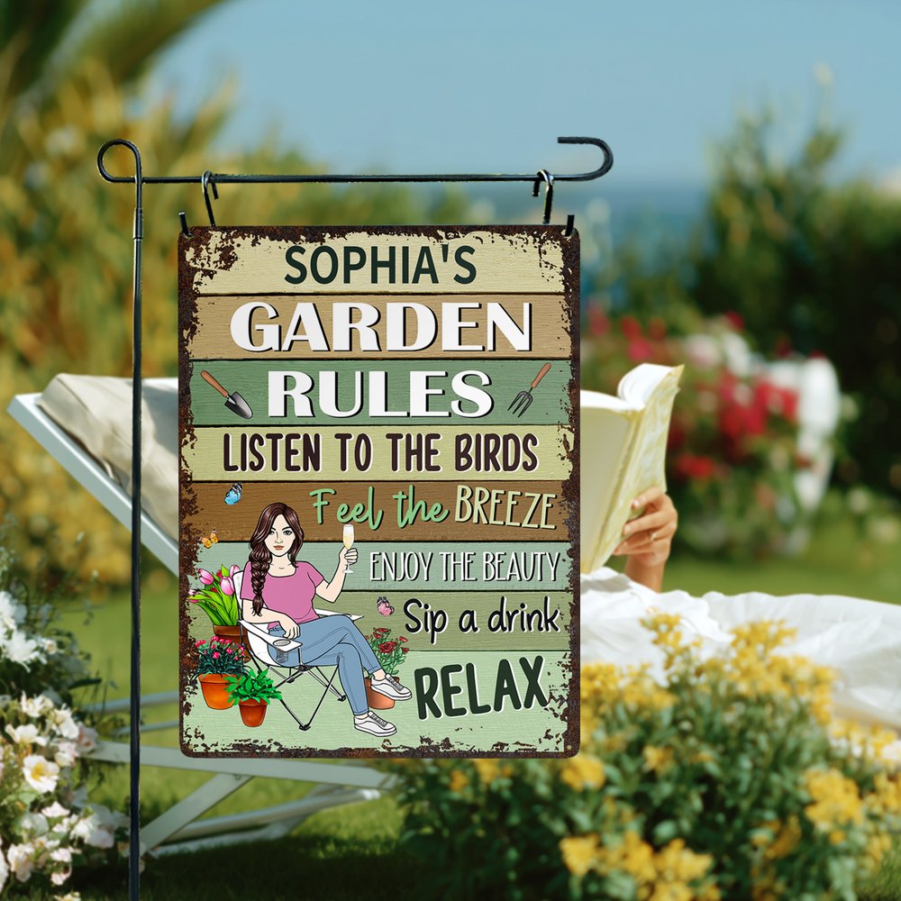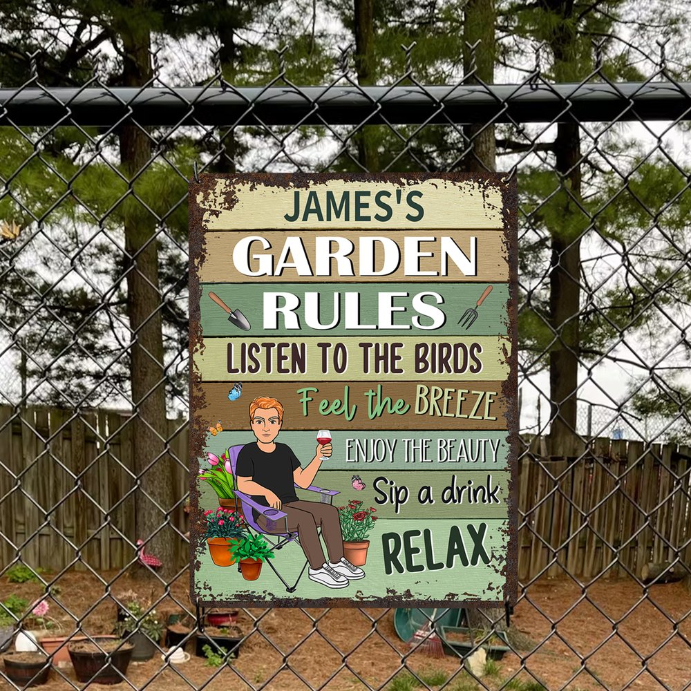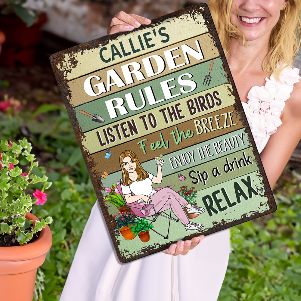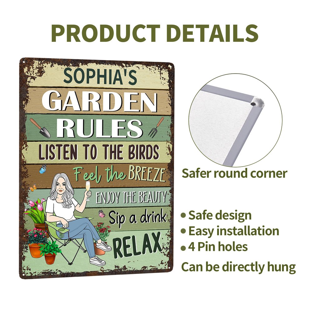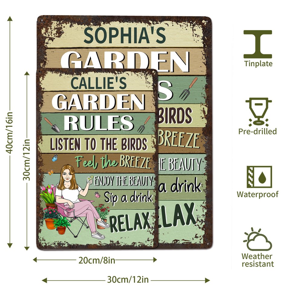 Tässä viehättävässä metallisessa kyltissä on omituinen sarjakuvamainen puutarhanhoitohahmo, joka nojaa tuolille ja pitää juomaa kädessään, mikä tuo puutarhaan eloisan lisän. Sen keskipisteenä on teema "GARDEN RULES", ja se sisältää vilkkaita elementtejä, kuten puutarhatyökaluja ja kasveja, jotka luovat viihtyisän ja rennon ilmapiirin. Retro-reunat lisäävät sen maalaismaista charmia, ja räätälöity nimi antaa sille ainutlaatuisen persoonallisuuden.