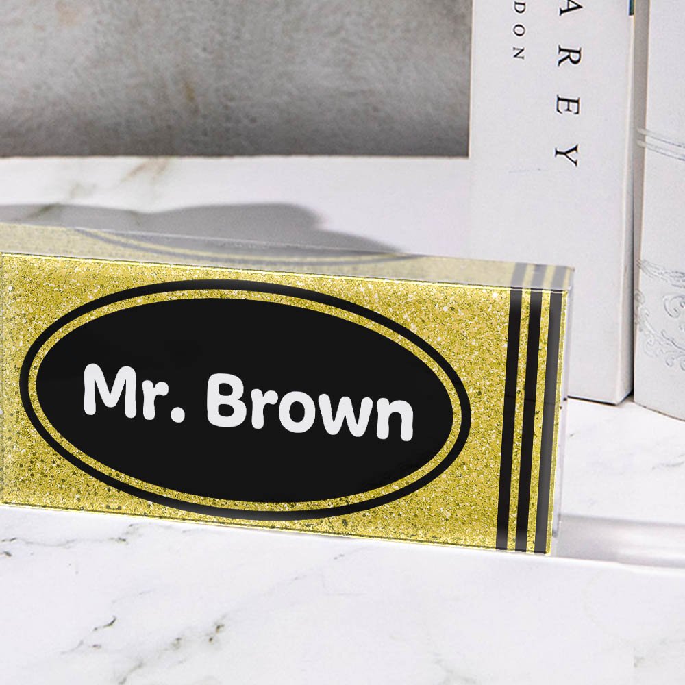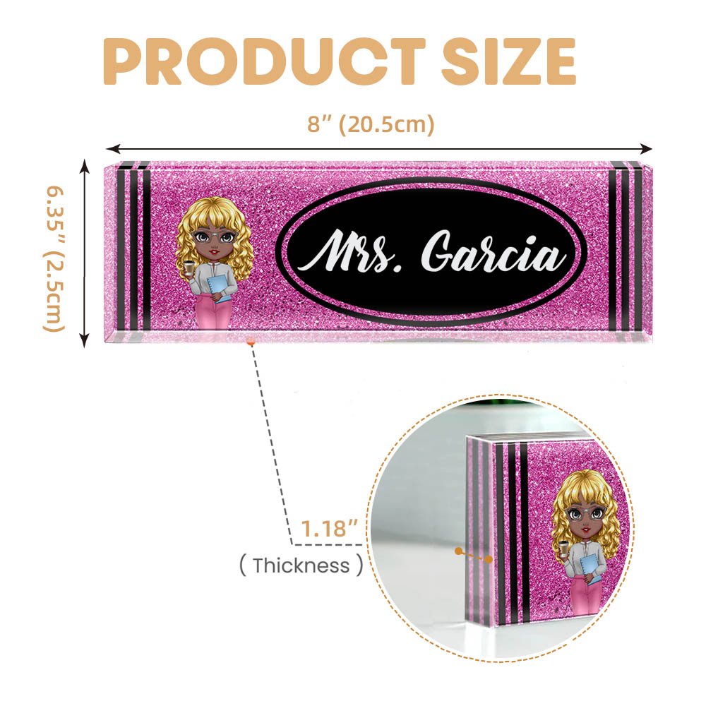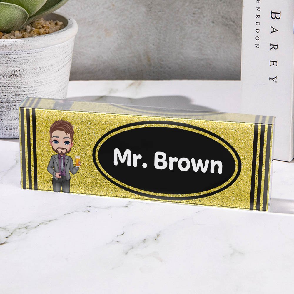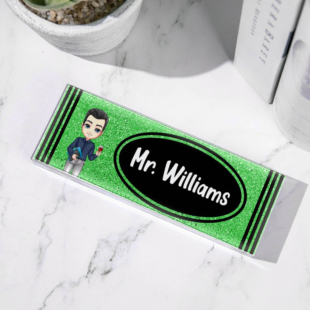 Tämä akryylinen kirjoituspöydän nimikyltti kuvastaa jokaisen opettajan ainutlaatuista persoonallisuutta. Valitse heidän ulkonäköönsä sopiva sarjakuvahahmo sekä mies- että naispuolisena ja lisää heidän nimensä luodaksesi yksilöllisen, mukautetun nimikilven.