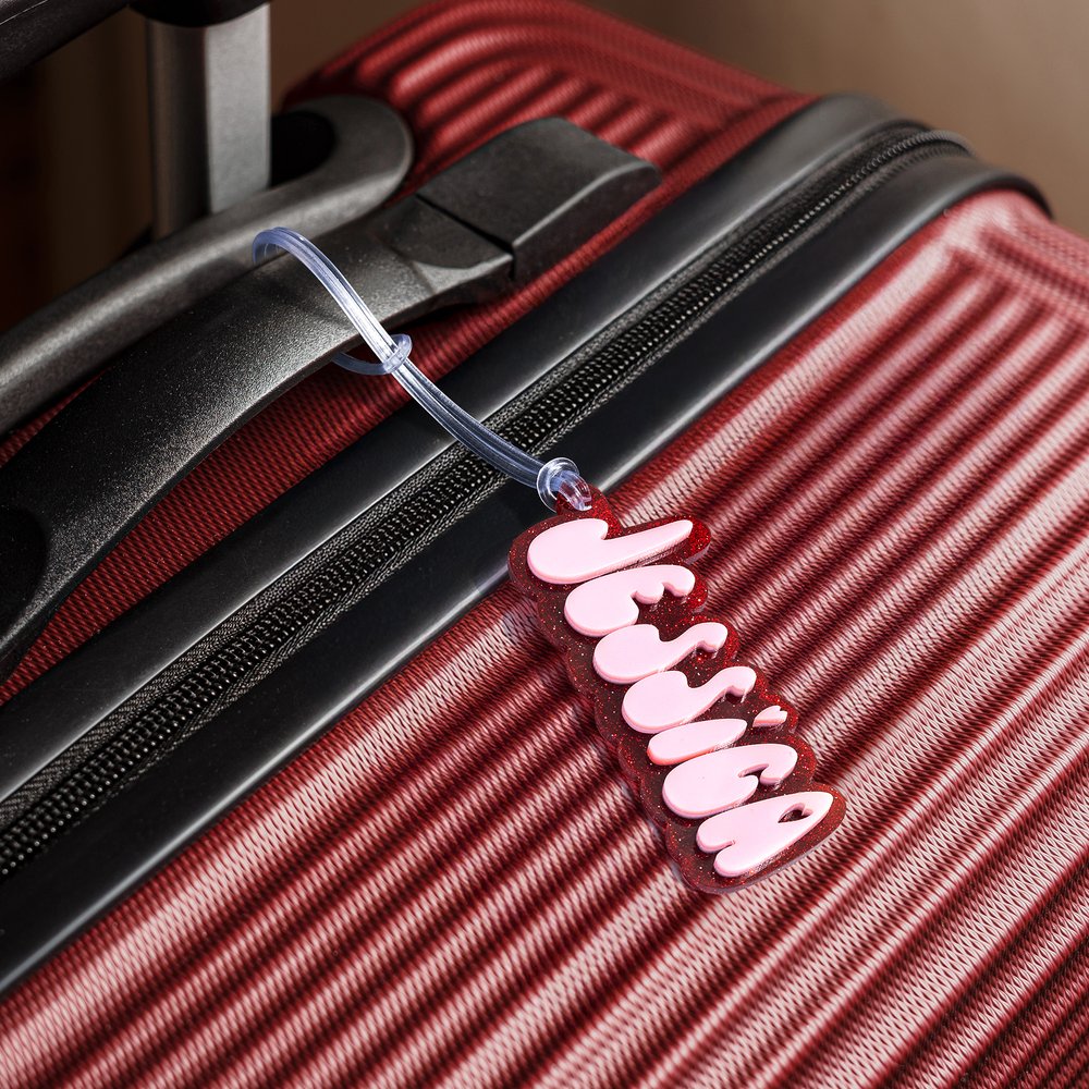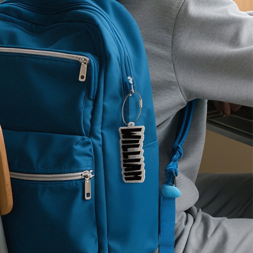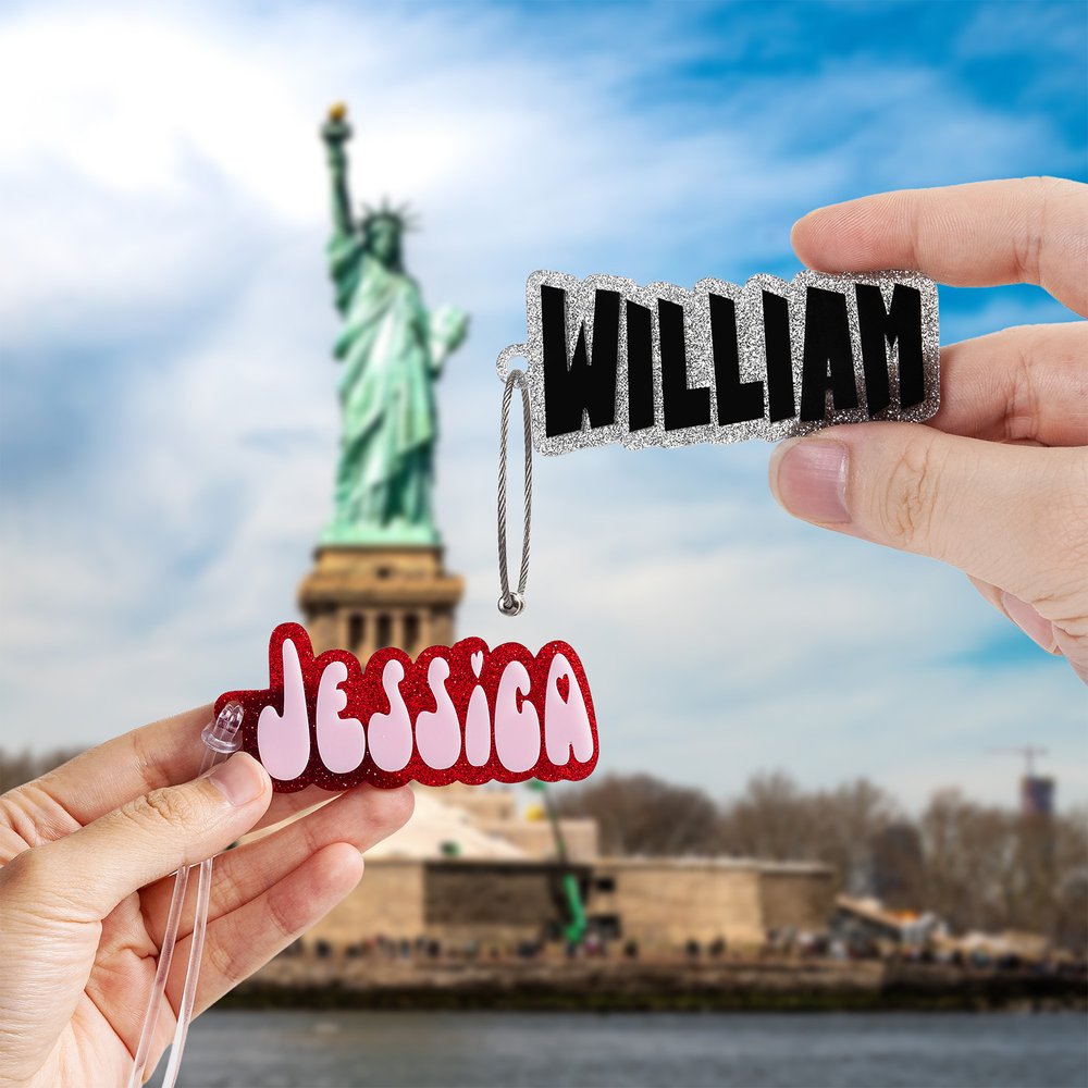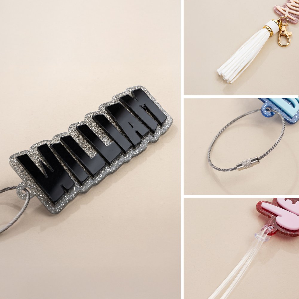 Saatavana yksilöllinen nimi räätälöinti eri värivaihtoehtoja. Silmäänpistävä glitter-muotoilu yhdistyy selkeään akryylimateriaaliin optimaalisen näkyvyyden ja tyylin saavuttamiseksi. Jokainen tunniste voidaan räätälöidä vastaamaan henkilökohtaisia mieltymyksiä säilyttäen samalla toiminnallisuuden.