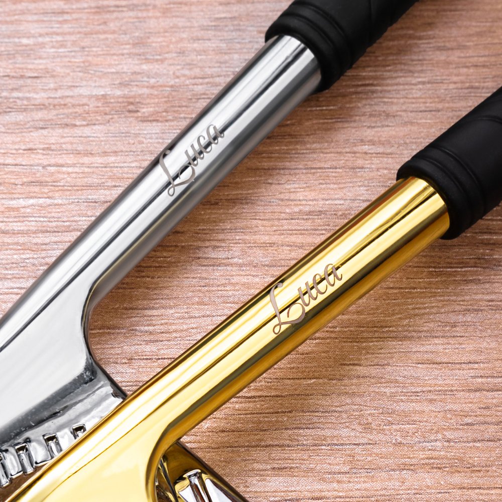 Tässä pullonavaajassa on ainutlaatuinen golfmaila keskeisenä muotoiluelementtinä, ja siinä yhdistyvät taitavasti urheilun energia ja hienostuneisuus. Yleismuoto jäljittelee golfmailan klassisia linjoja, ja hopean ja pronssin värimaailma tuo vintage-vaikutelmaa, mikä luo visuaalisesti näyttävän kohokohdan. Huolellinen kosketus on mahdollisuus räätälöidä kahva nimelläsi, mikä tekee jokaisesta pullonavaajasta ainutlaatuisen. Tämä ei ainoastaan osoita rakkautta golfia kohtaan, vaan välittää myös henkilökohtaisen yksilöllisyyden ja tyylin.
