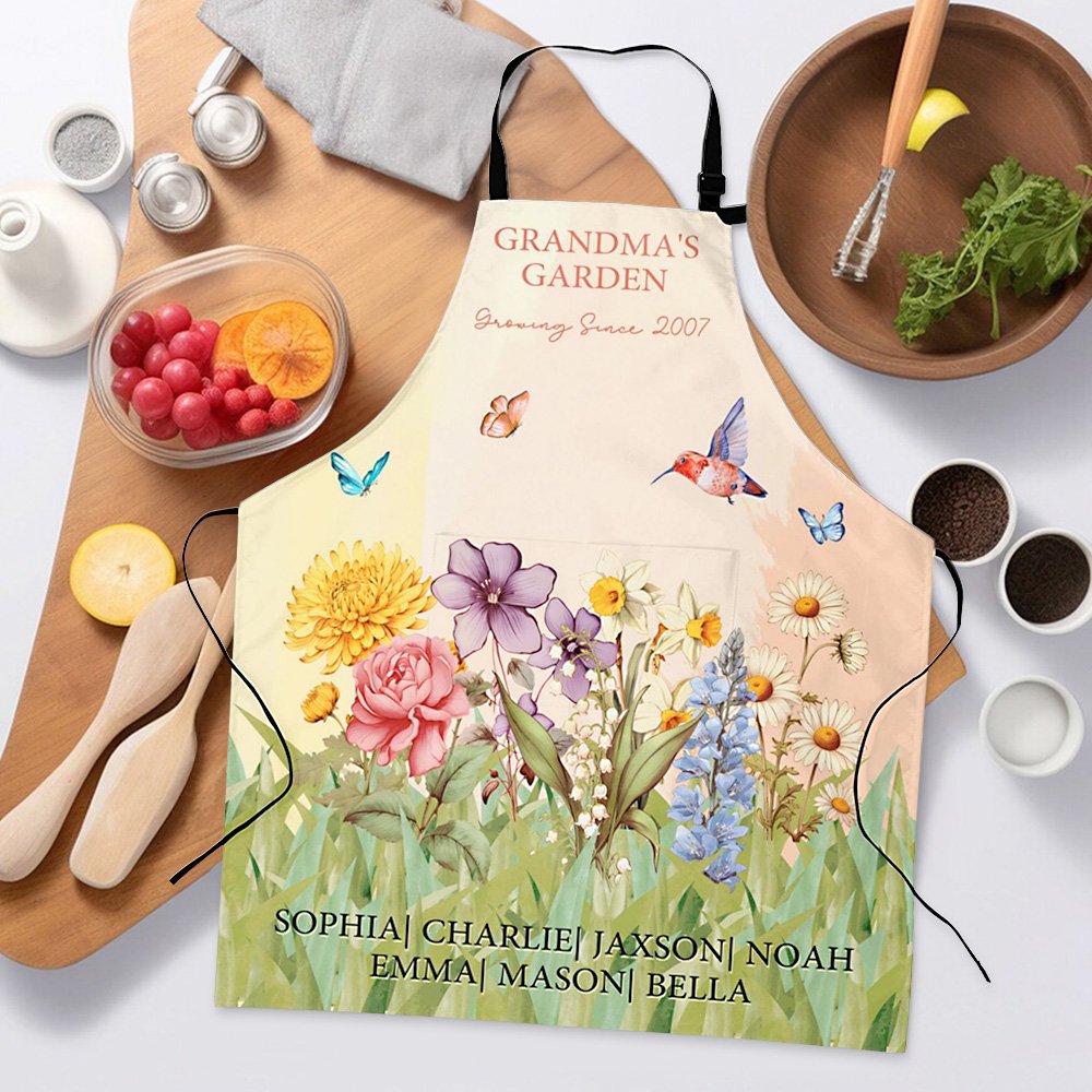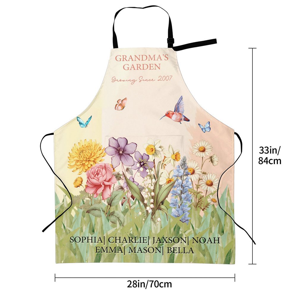 Henkilökohtainen isoäidin puutarha 2-15 syntymäkukat säädettävä esiliina teksti ja etutasku syntymäpäivälahja isoäiti ruoanlaitto rakastajaille