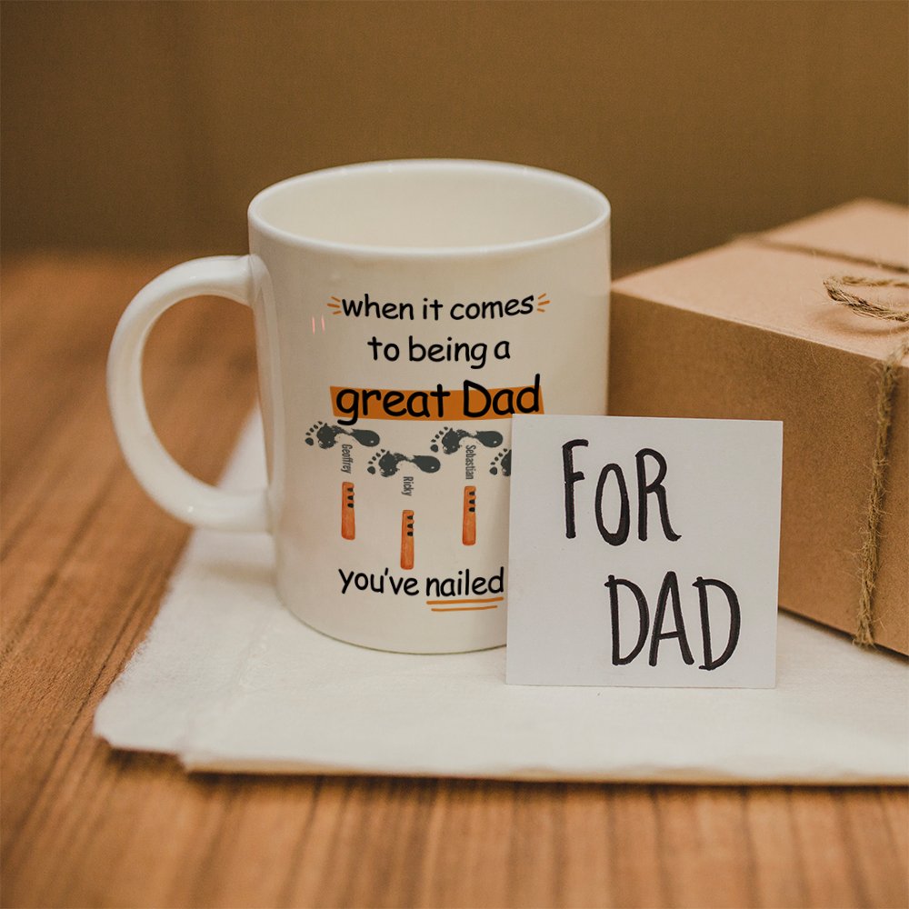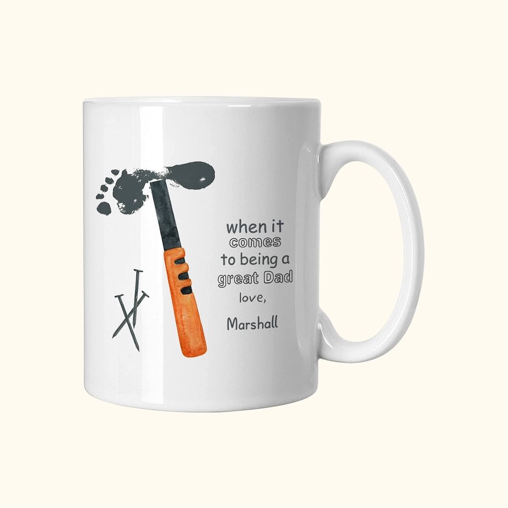 Make this gift truly one-of-a-kind by personalizing it with names. The quote "When it comes to being a great dad, you've nailed it." and hammer footprint design is complemented by the option to add names, creating a heartfelt and personalized touch that will warm their heart every time they use this mug. It's a wonderful way to express your love and appreciation for all the hard work and dedication they have put into being an exceptional father or grandfather.