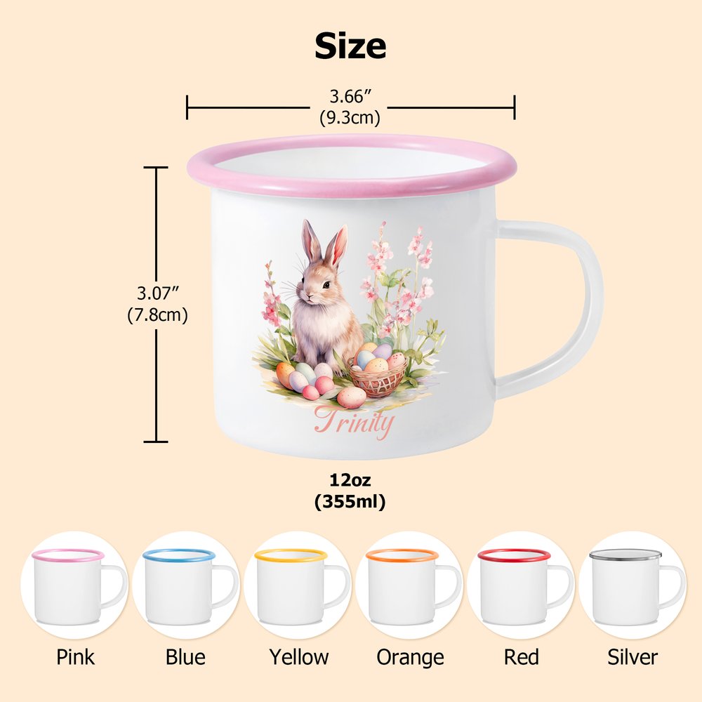Emalimukeissamme on klassinen, käsin maalattu vesivärityyli, jossa yhdistyvät pastoraaliset teemat, lapsenomainen viehätysvoima ja juhlalliset elementit. Ne esittävät poikia, tyttöjä tai kaneja, jotka kantavat värikkäitä munakoreja, ja niissä on herkät ja pehmeät ääriviivat. Yleinen muotoilu on raikas, täynnä keväistä charmia ja lämpöä. Jokainen muki voidaan personoida nimellä, mikä tekee siitä ainutlaatuisen muistoesineen lapsille.