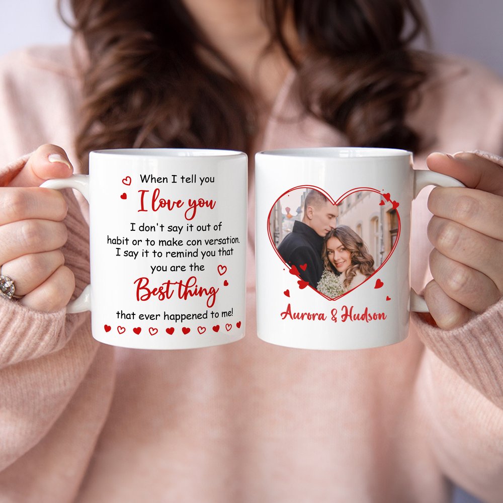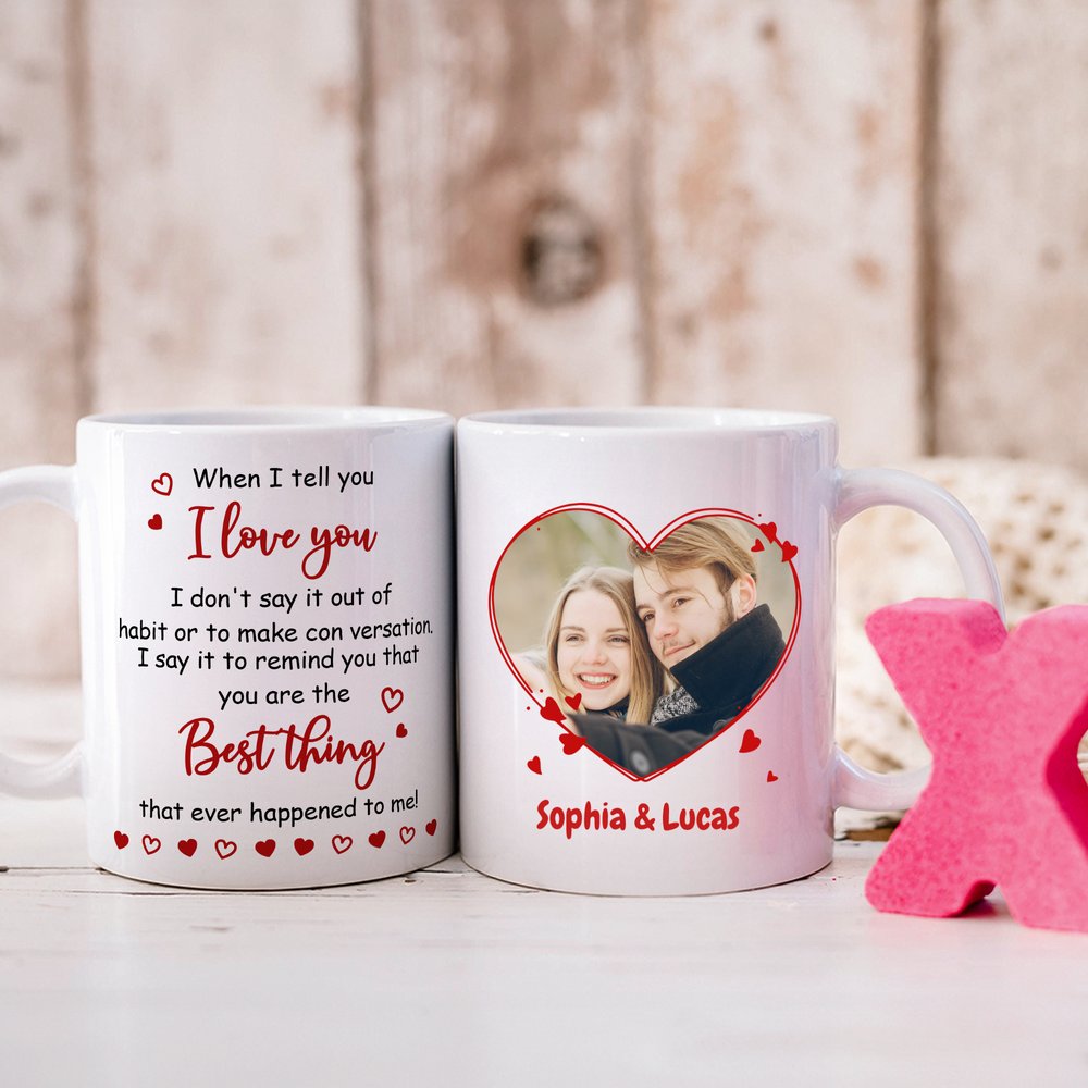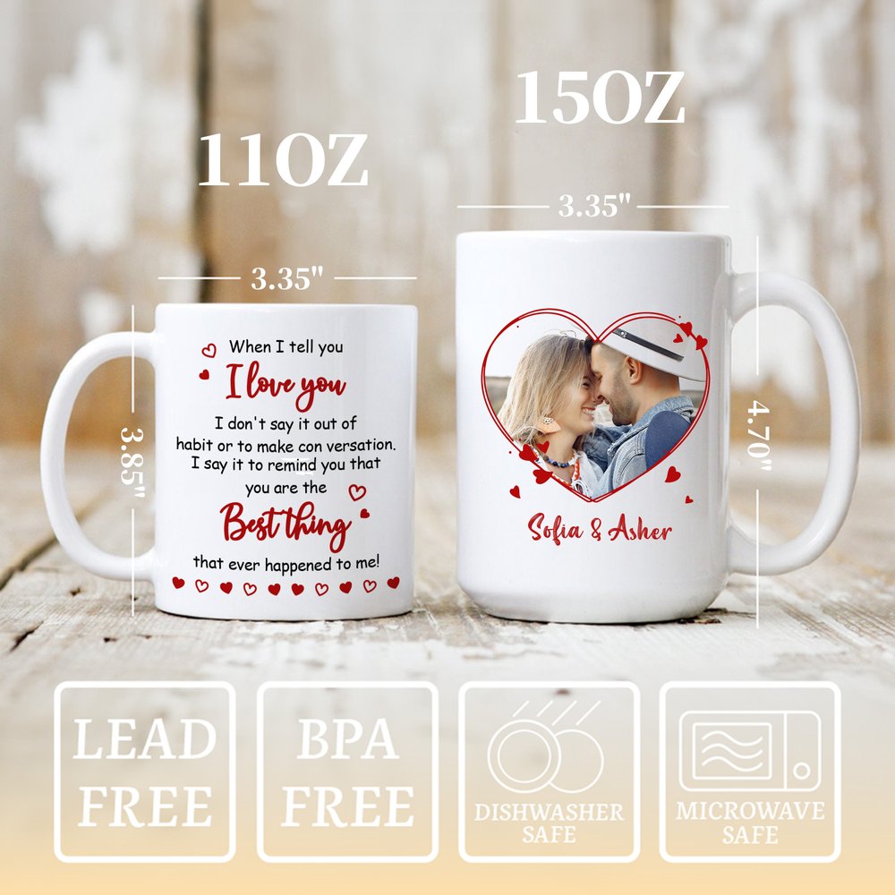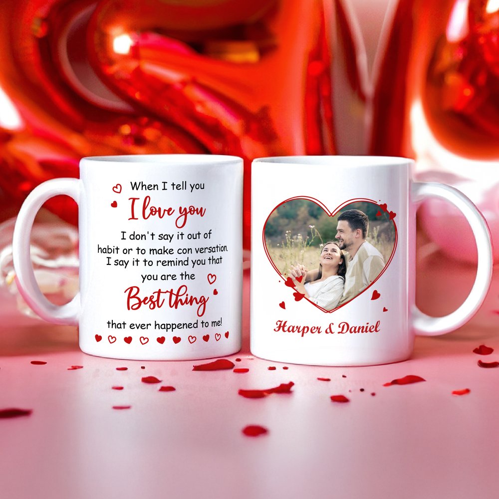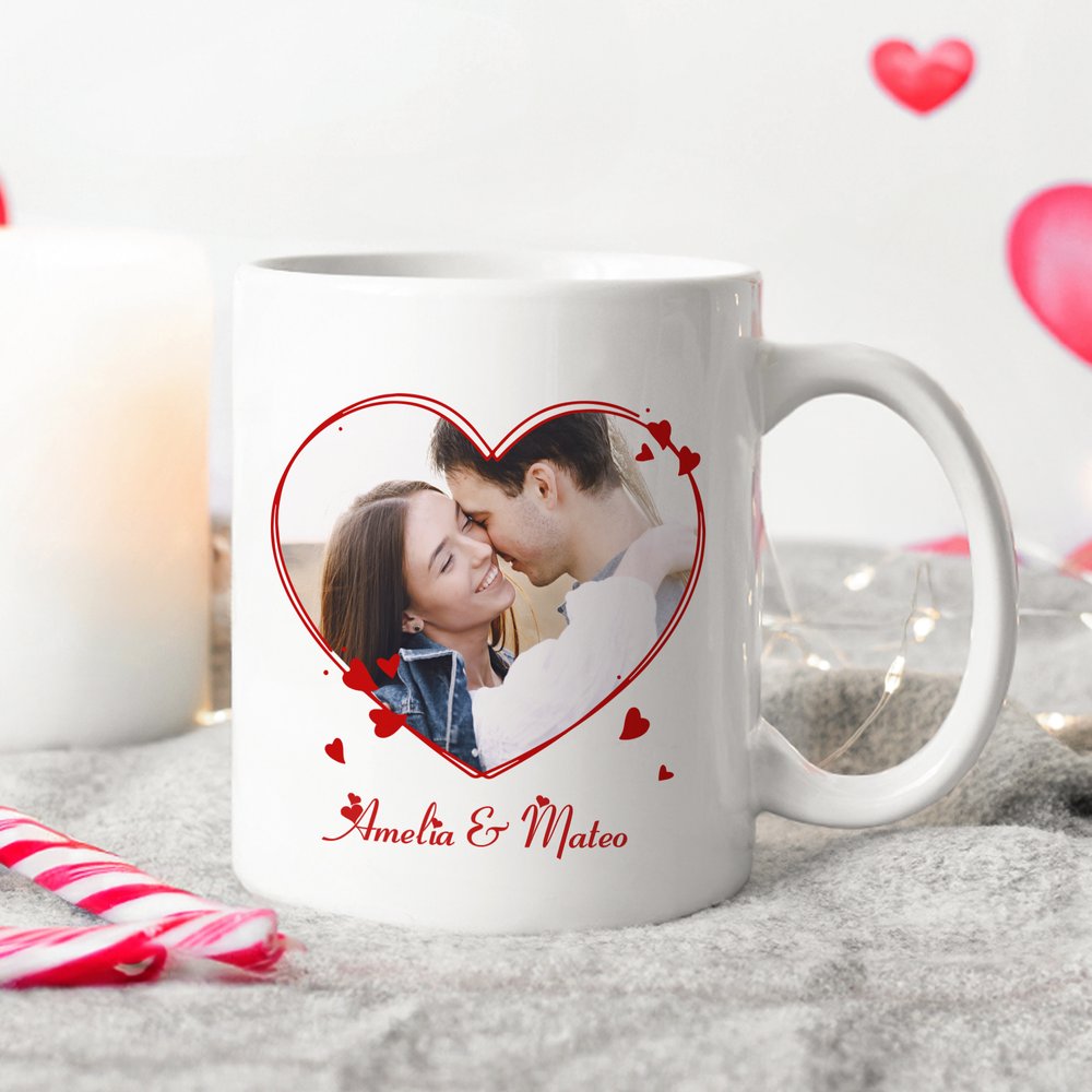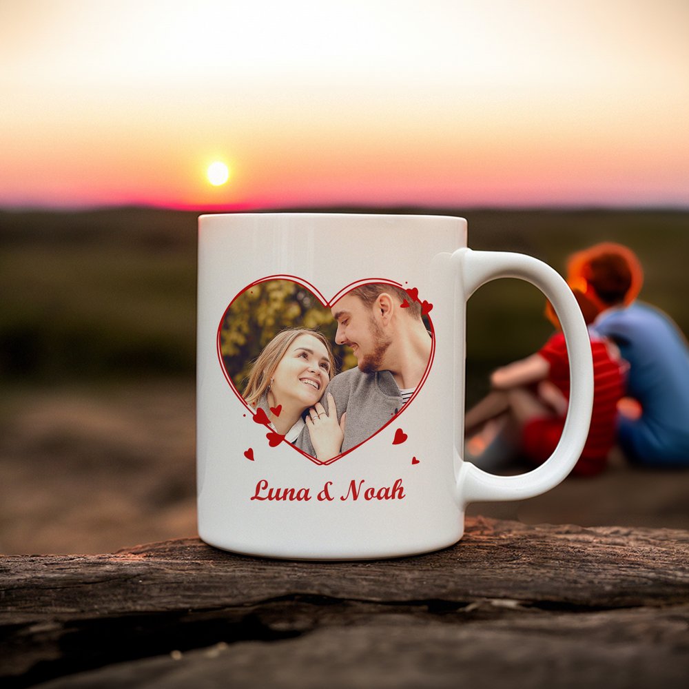 Sydämenmuotoinen reunus ympäröi parin valokuvaa, jota koristavat punaiset sydänkoristeet ja rakkaudentunnustus. Kaksipuolinen muotoilu antaa molemmille osapuolille mahdollisuuden ilmaista tunteensa toisella puolella ja vaalia muistoja toisella puolella. Mukiin on mahdollista lisätä nimiä ja valokuvia, mikä luo lämpimän ja lohdullisen tyylin, joka tekee tästä mukista visuaalisen muiston rakkaudestanne.