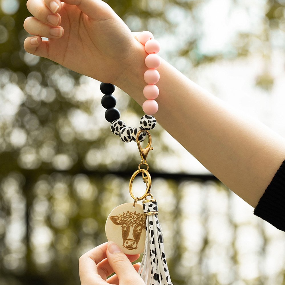 Tässä rannekkeen avaimenperässä on söpö boheemi lehmänkuvio, jossa yhdistyvät muoti ja käytännöllisyys. Rannekoru on valmistettu silikonihelmistä ja joustavasta köydestä, ja siinä on hummerilukko ja avaimenperä, jossa on yhteensopiva tupsu. Metallirengas ja hummerilukko eivät lohkeile helposti ja säilyttävät kiiltonsa pitkään.