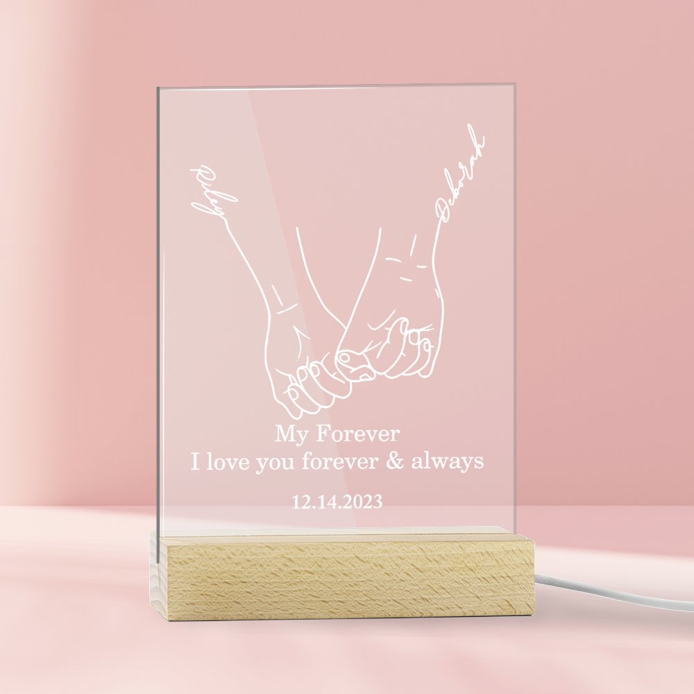 Tässä akryylilaatassa on sydäntä lämmittävä kuvio, jossa kaksi kättä pitää toisiaan tiukasti kiinni, mikä symboloi kahden syvästi rakastuneen ihmisen välistä sidettä ja kiintymystä. Eloisa LED-sateenkaari-yövalo luo maagisen tunnelman ja heittää kauniin värispektrin, joka säteilee lämpöä ja rakkautta.