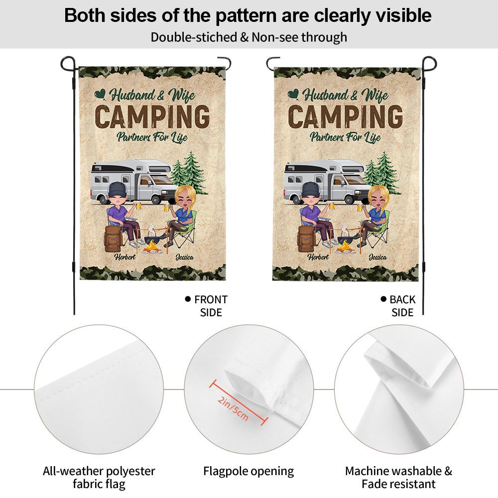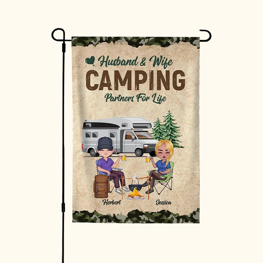 This customized garden flag is the perfect gift for a husband and wife who love camping together. The personalized design includes the couple's names, adding a romantic touch to their outdoor space.