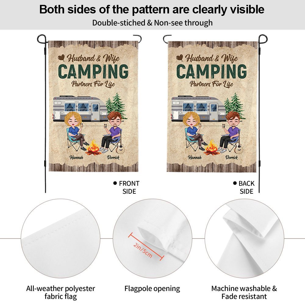 This customized garden flag is the perfect gift for a husband and wife who love camping together. The personalized design includes the couple's names, adding a romantic touch to their outdoor space.