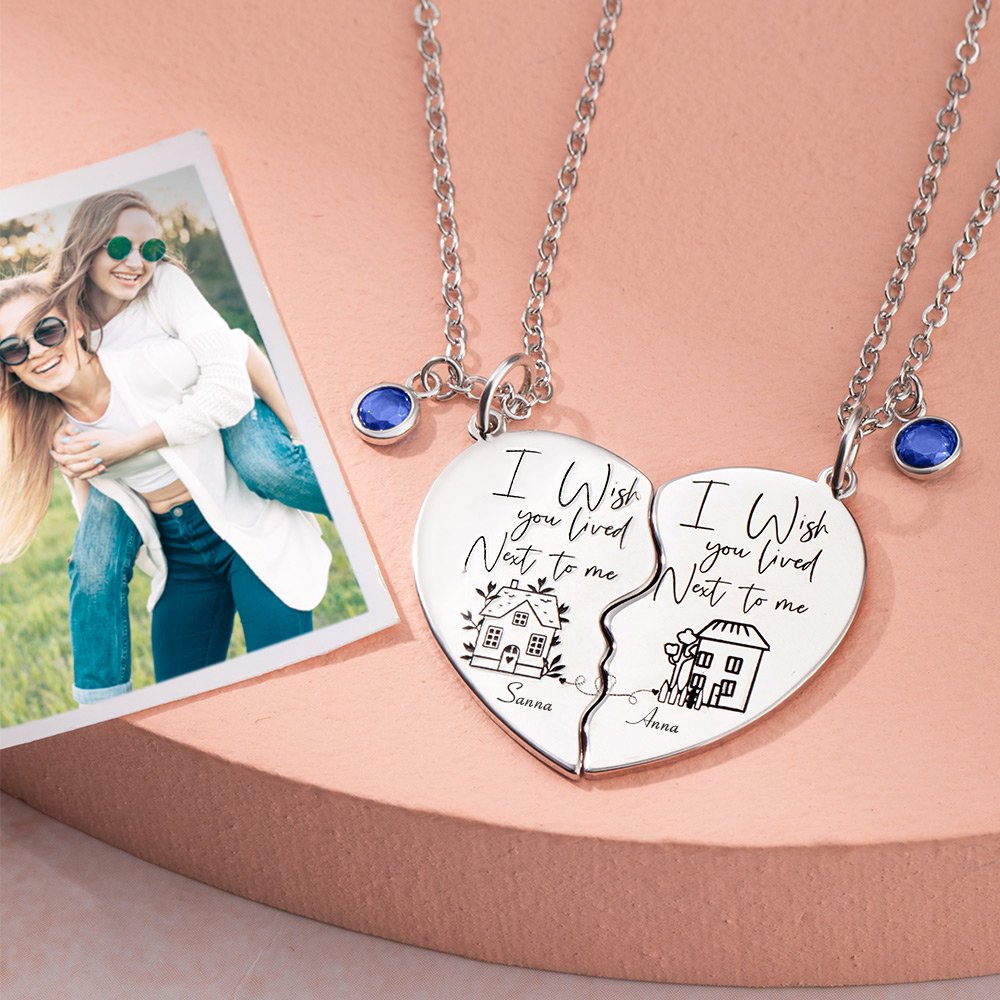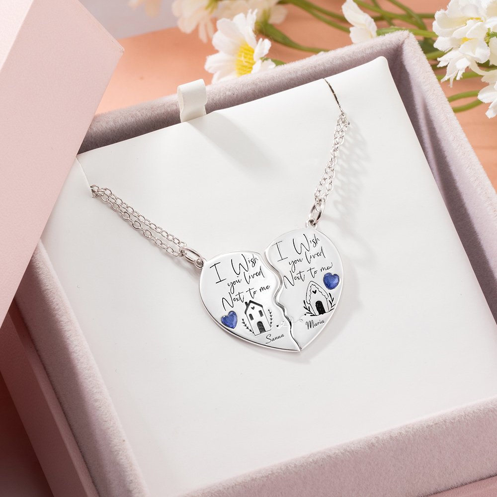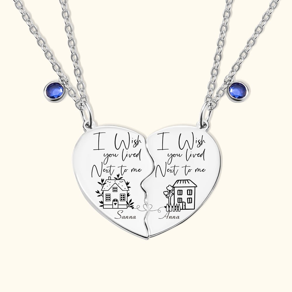 Tämä kaksinkertainen kaulakoru kuvastaa ystävien välistä syvää ystävyyttä ainutlaatuisella suunnittelukonseptilla. Kaulakoru on jaettu kahteen osaan, jotka yhdessä muodostavat sydämen muodon. Saatavilla on kaksi syntymäkivimallia, sydämen muotoinen ja pyöreä, ja jopa 12 talokuviota. Kumpaankin osaan voidaan kaivertaa nimi, talo ja syntymäkivi, mikä symboloi "naapureiden" läheistä ystävyyttä. Sillä ei ole vain lämmin merkitys, vaan se on myös täynnä romanttisia ja henkilökohtaisia yksityiskohtia, jotka ilmaisevat täydellisesti toiveen "Toivon, että olet vierelläni".