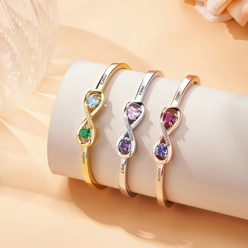 Tämä rannekoru korostaa ikuista rakkautta ainutlaatuisen äärettömyyssymbolin kautta. Voit henkilökohtaisistaa sen valitsemalla kaksi syntymäkuukauden kiveä, yhden itsellesi ja toisen rakkaallesi, ja kaivertamalla nimet muistoksi, jota katsot ikuisesti.
