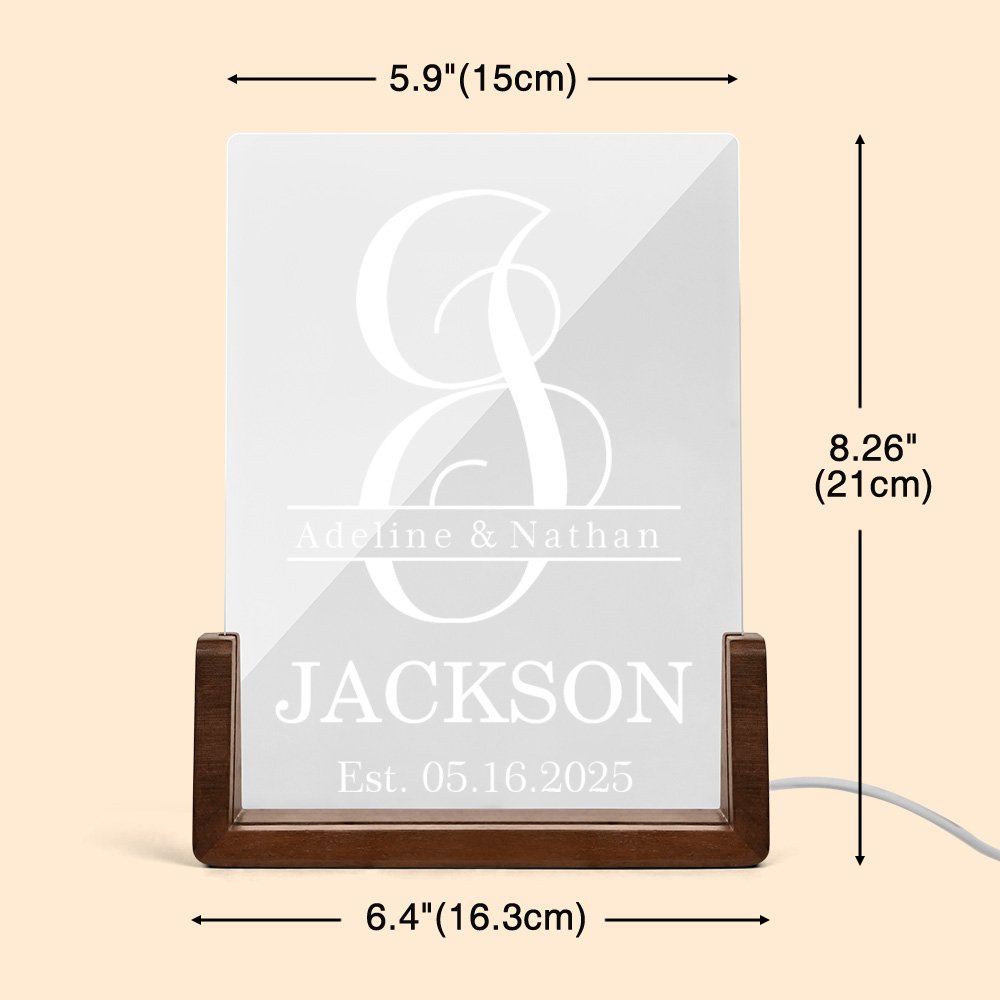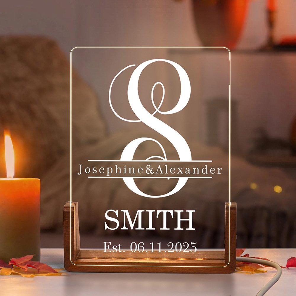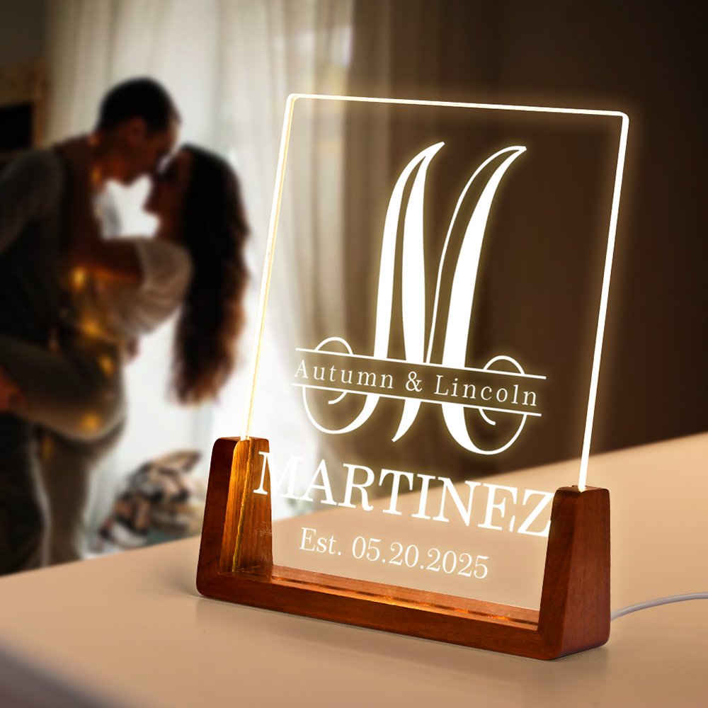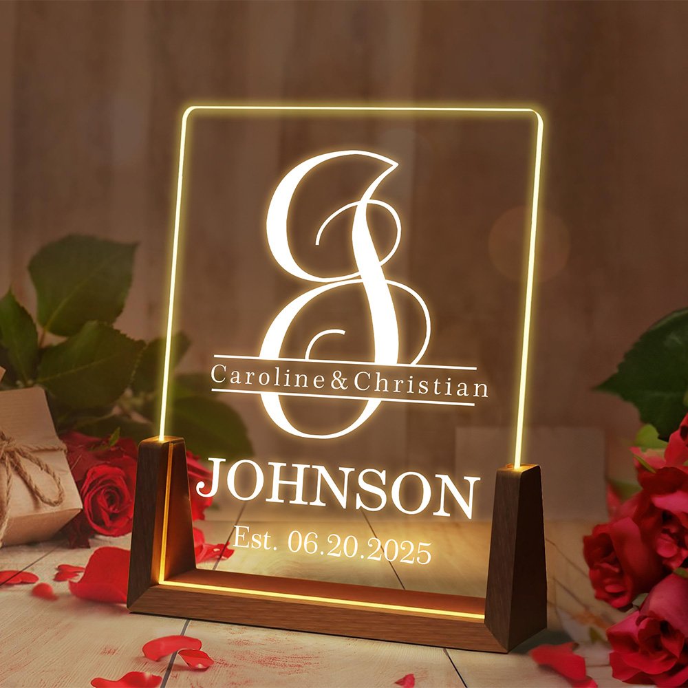 Henkilökohtainen Alkuperäinen akryyli LED-yövalo puupohjalla ja nimellä Lahja Home Decor Hääpäivä Newlywed Pariskunta