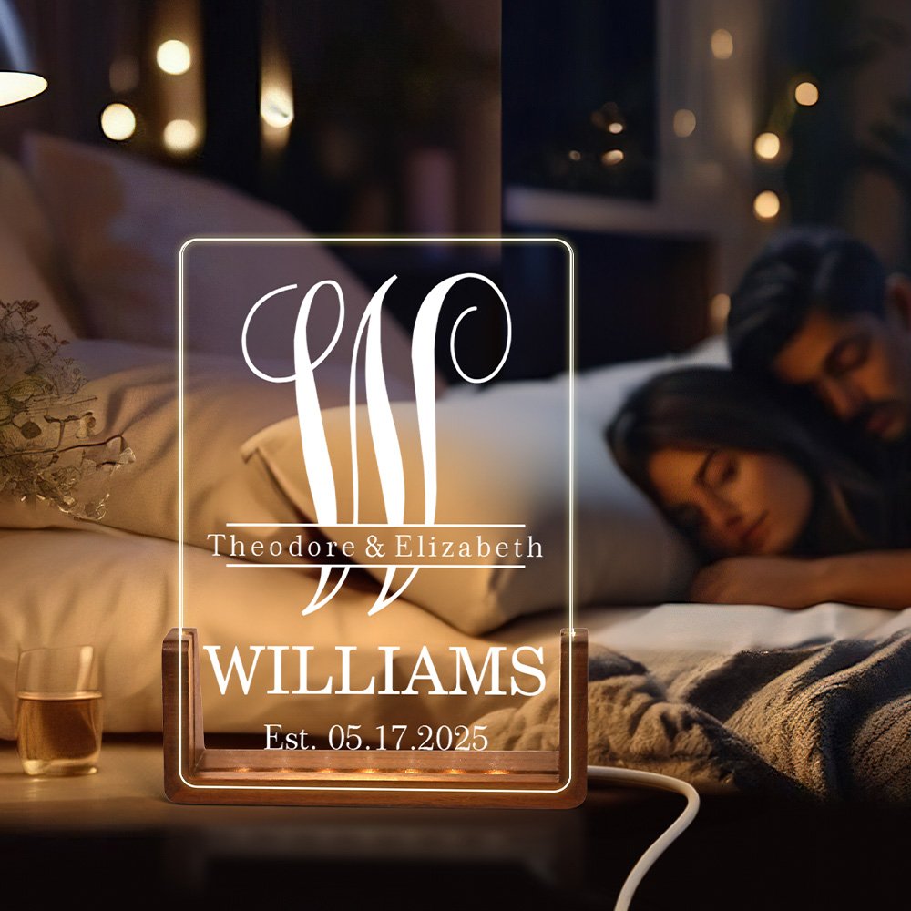 Tämän yövalon nimikirjaimet on suunniteltu taiteellisesti, ja yleinen tyyli on sekä romanttinen että moderni. Voit tulostaa etunimen, sukunimen ja päivämäärän puolisosi ainutlaatuisen merkityksen. Luo muistolahja, joka on ainutlaatuinen toisillenne.