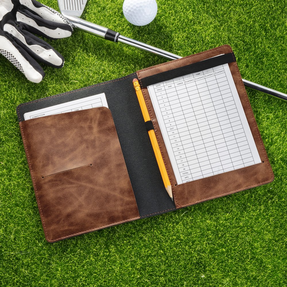 Golfpistekorttitelineessämme on kaksi erityistä taskua golfpistekorttien turvalliseen säilyttämiseen, joten golfareiden on helppo seurata suorituksiaan. Mukana on myös nahkainen minikynäteline, joka takaa, että olet aina valmis kirjoittamaan muistiin jokaisen ikimuistoisen hetken. Lisäksi tarjoamme tuloskorttivaihtoehtoja, joiden avulla voit valita tarpeidesi mukaan.