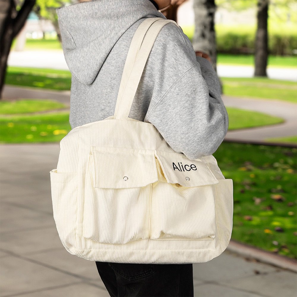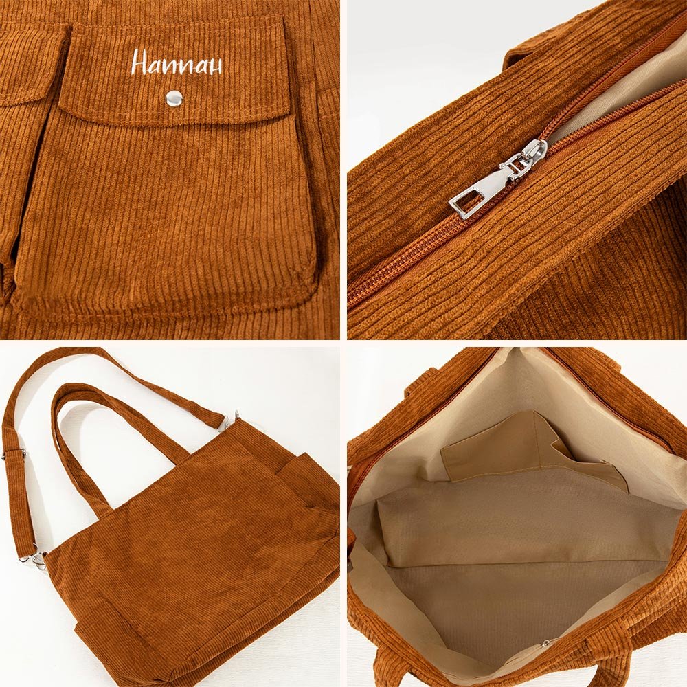 Tässä tyylikkäässä corduroy-kangaskassissa on ainutlaatuinen personointimahdollisuus kirjaillulla nimelläsi, mikä tekee siitä erottuvan lisävarusteen jokapäiväiseen käyttöön. Tarjoamme myös 7 erilaista nimifonttia, ja voit valita haluamasi perusteella. Laukun värejä on 6 kappaletta, joten voit ostaa parhaan, joka sopii täydellisesti pukuusi.