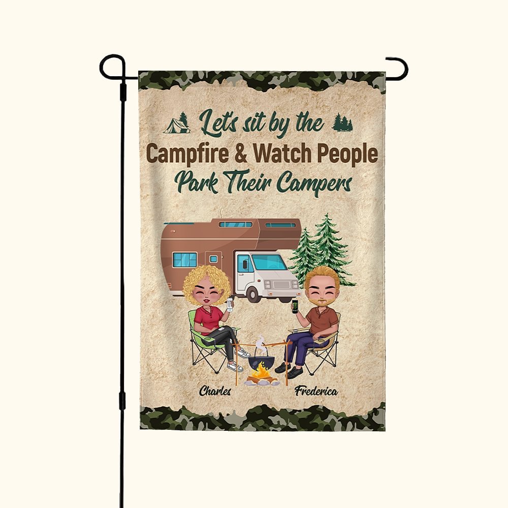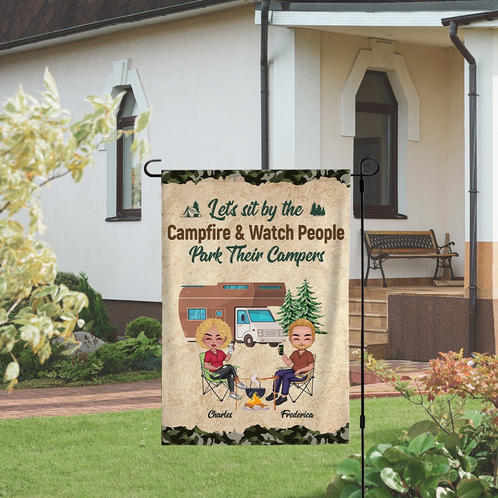 This customized garden flag is the perfect gift for a husband and wife who love camping together. The personalized design includes the couple's names, adding a romantic touch to their outdoor space.