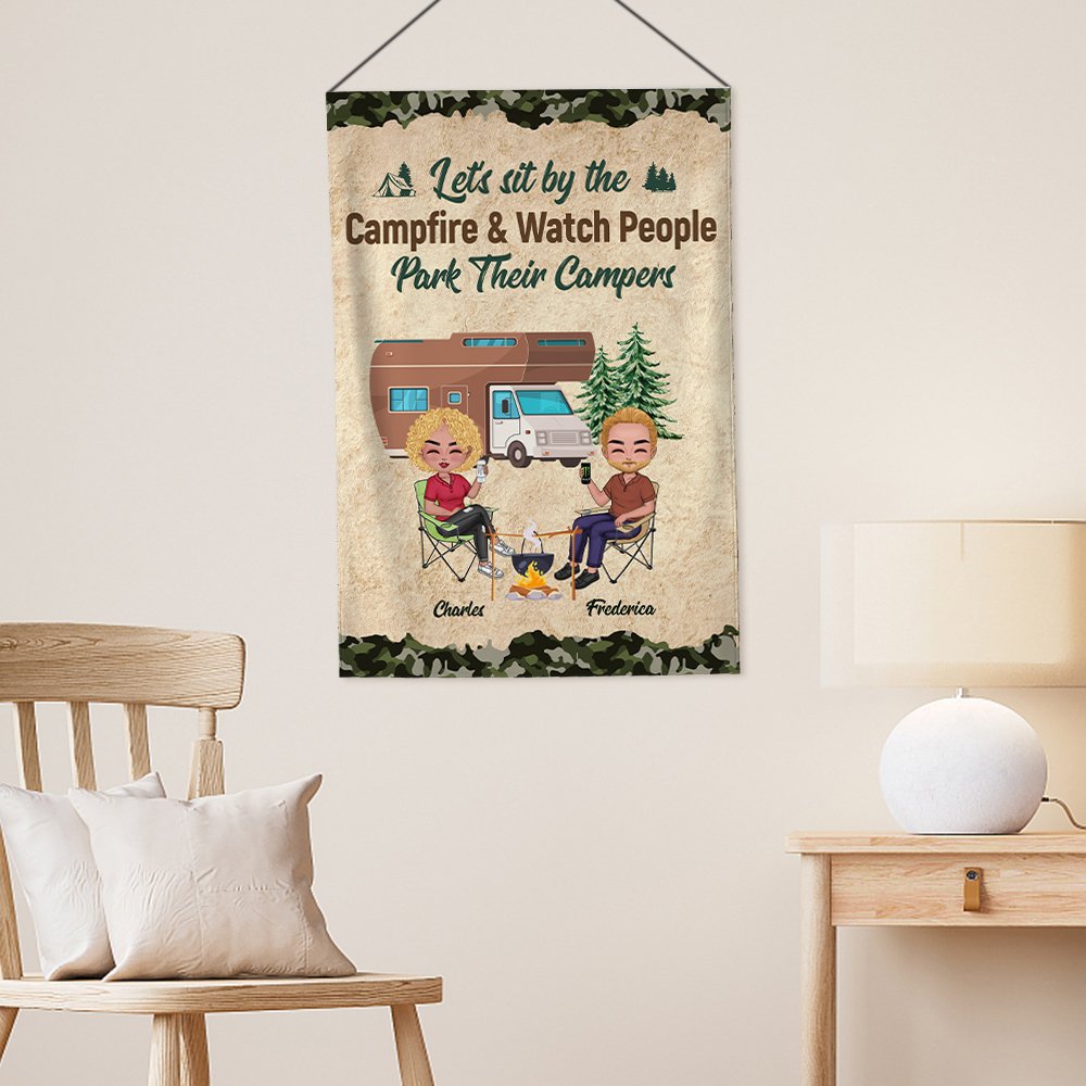 Henkilökohtainen Istutaan leirinuotiolla ja katsellaan, kun ihmiset pysäköivät leirintäautojaan Puutarha lippu Lahja pariskunnalle