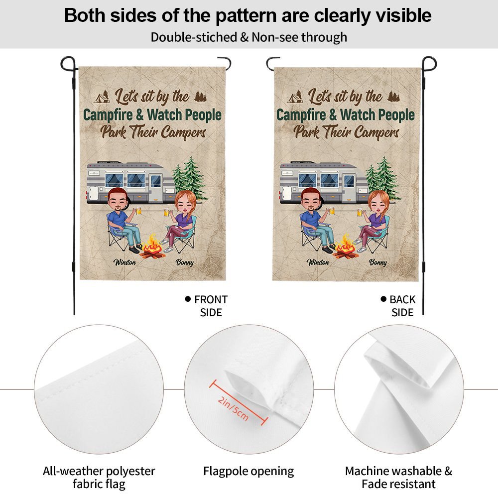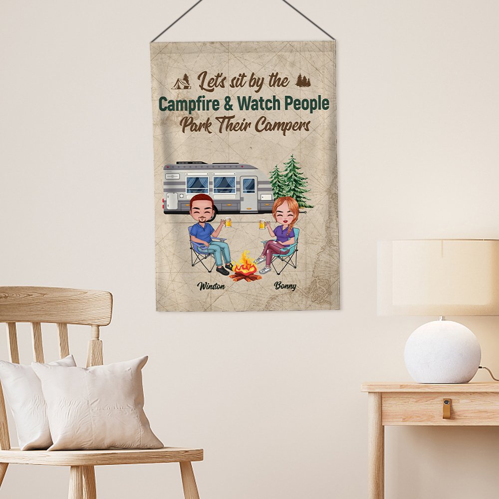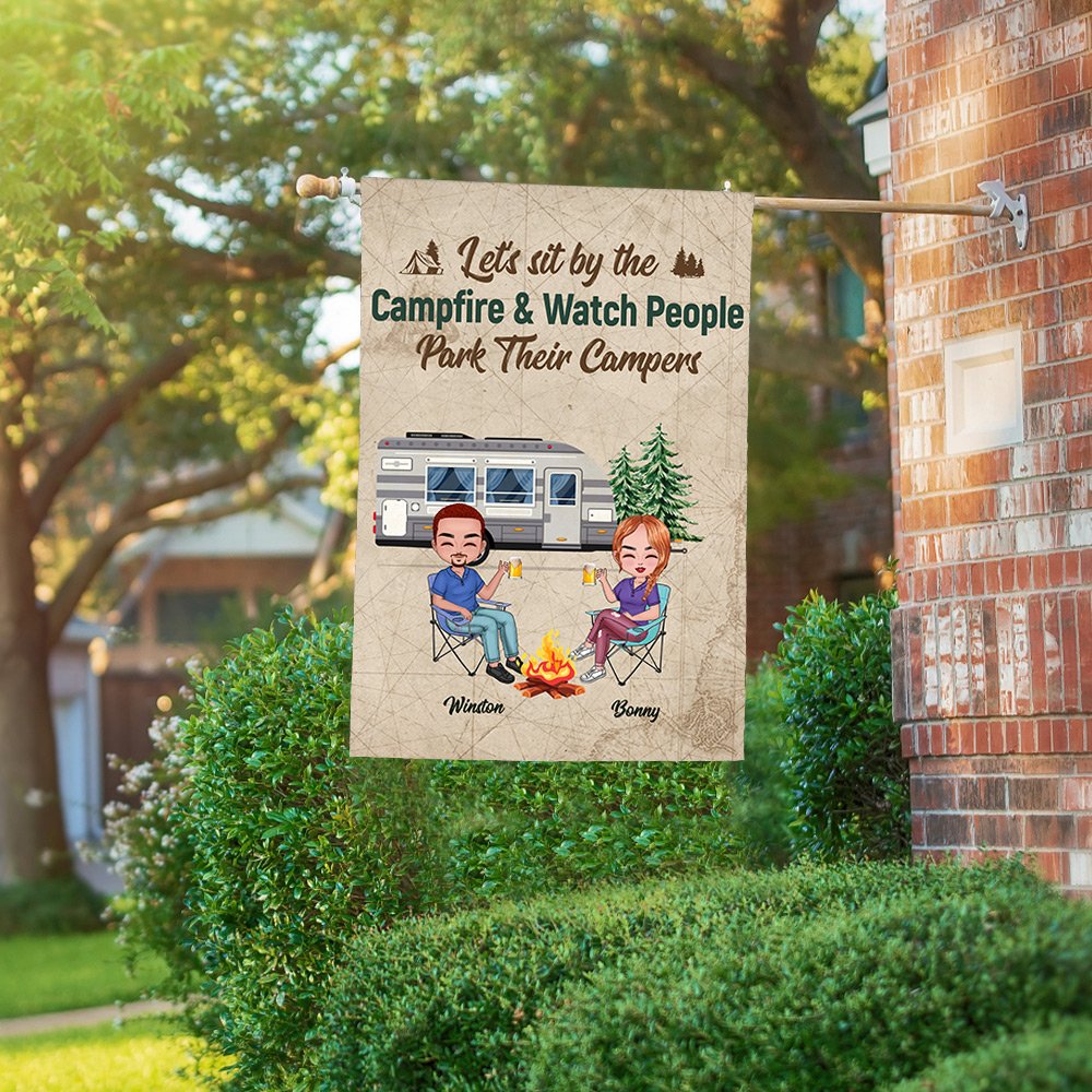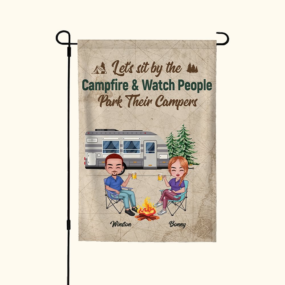 Henkilökohtainen Istutaan leirinuotiolla ja katsellaan, kun ihmiset pysäköivät leirintäautojaan Puutarha lippu lahjat leirintäalueille pariskunnille