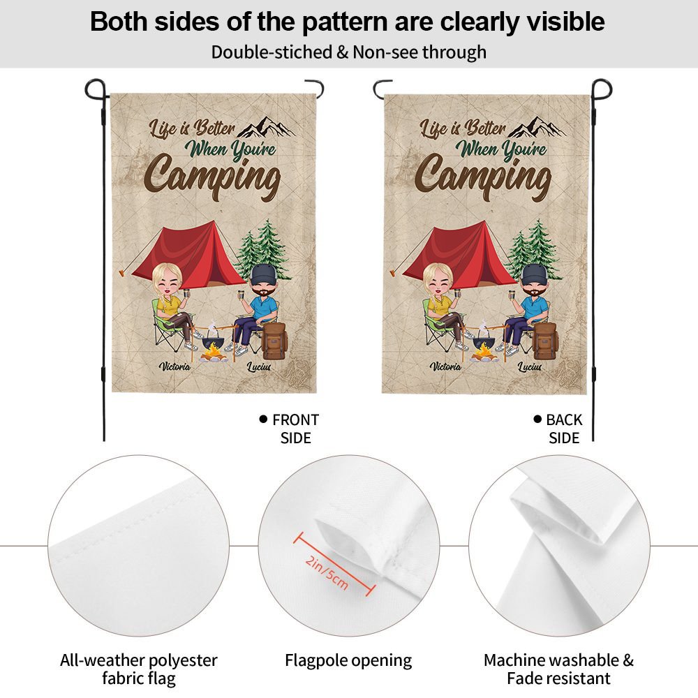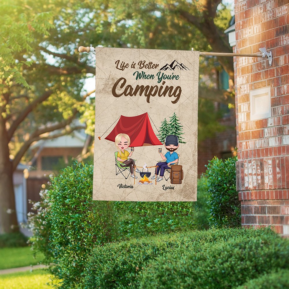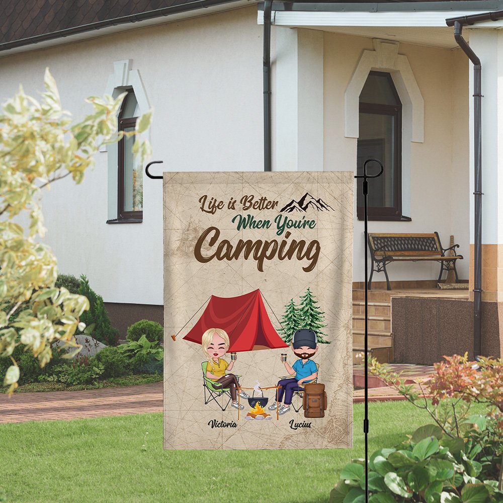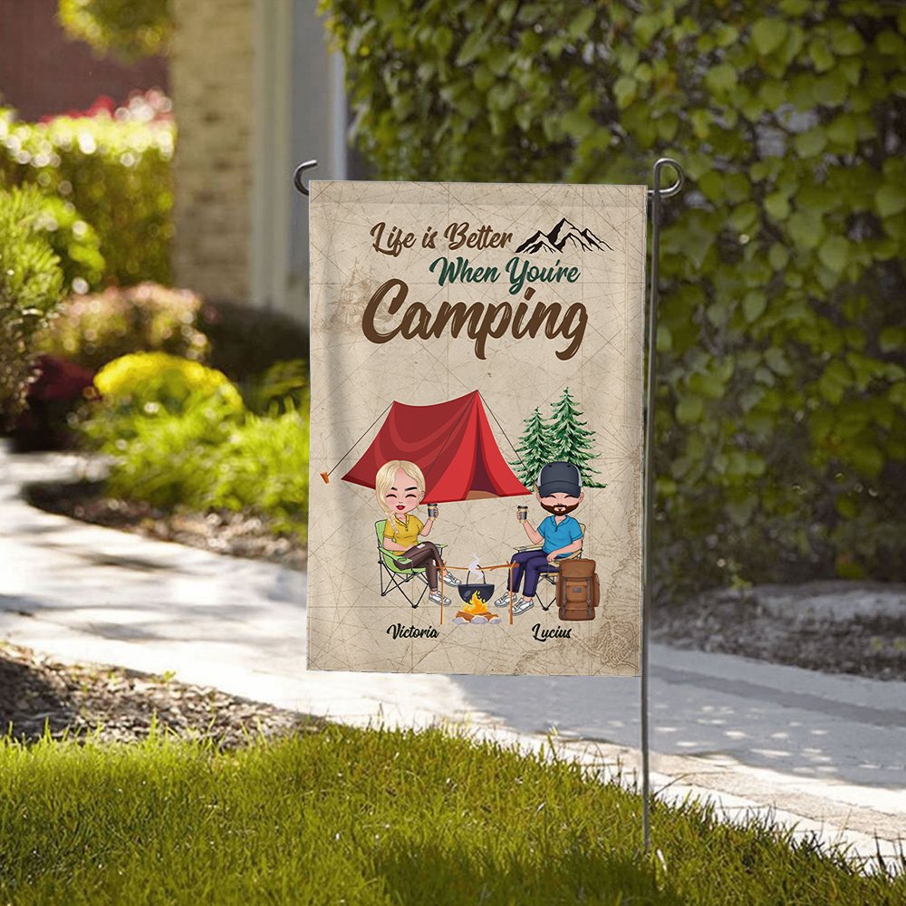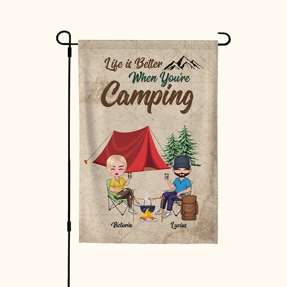 This customized garden flag is the perfect gift for a husband and wife who love camping together. The personalized design includes the couple's names, adding a romantic touch to their outdoor space.