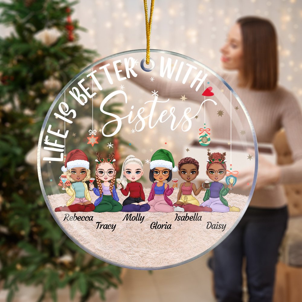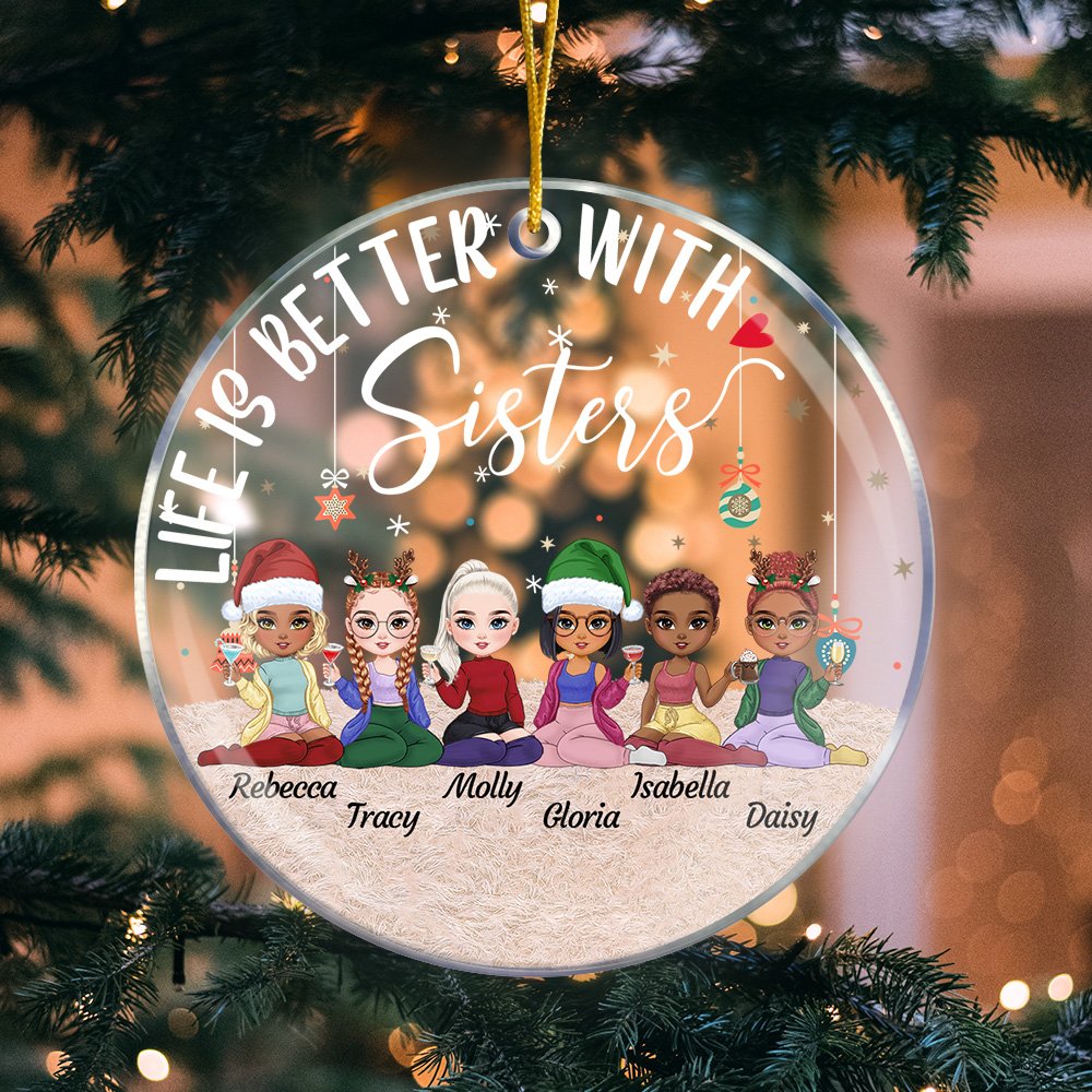 Uniquely designed, this acrylic hanging ornament features a charming scene combined with a Christmas element that shows a heartwarming image of friends spending time together. With the addition of "Life Is Better With Sisters" and a personalized message, it will be a special keepsake that celebrates the everlasting love between people.