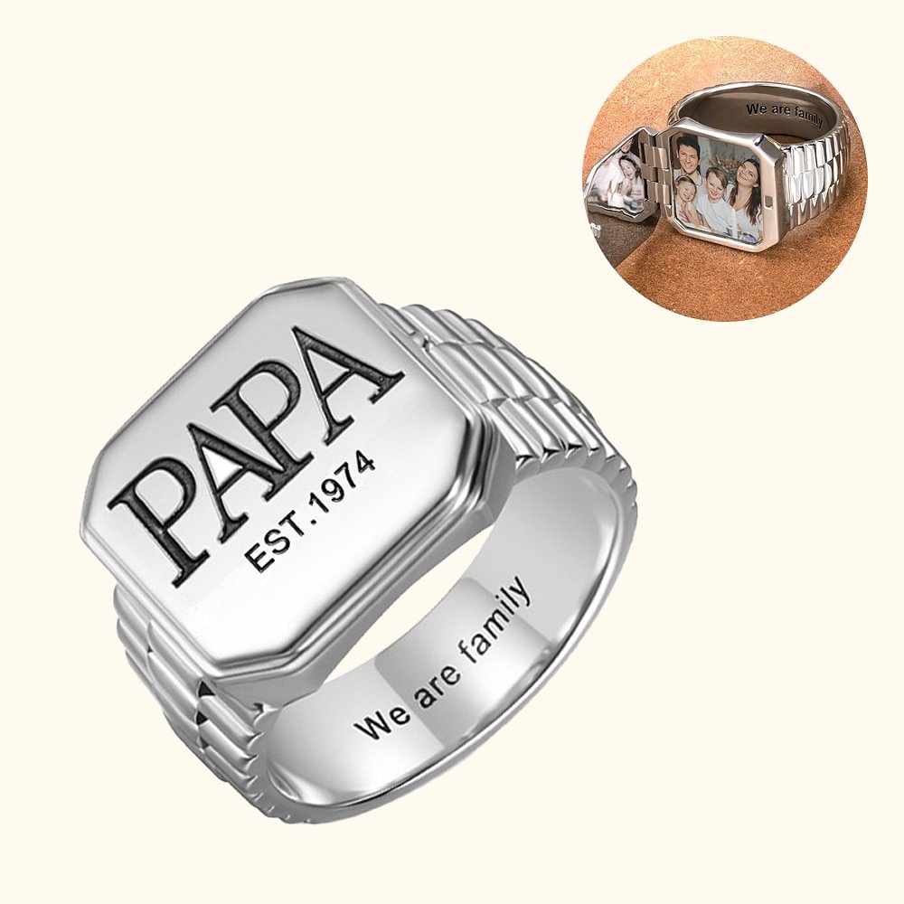 The locket on this ring is designed to hold a photo of your loved ones, making it an incredibly personal and meaningful piece of jewelry. You can choose any photo you want to engrave onto the ring, whether it's a picture of your children, family, pets, or even a memorable moment from your travels. The options are endless, and the result is a truly special piece that he can wear every day.