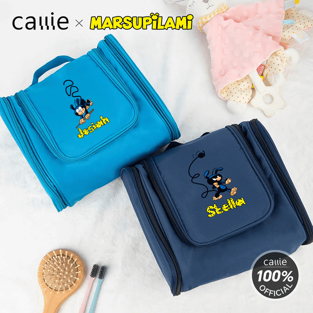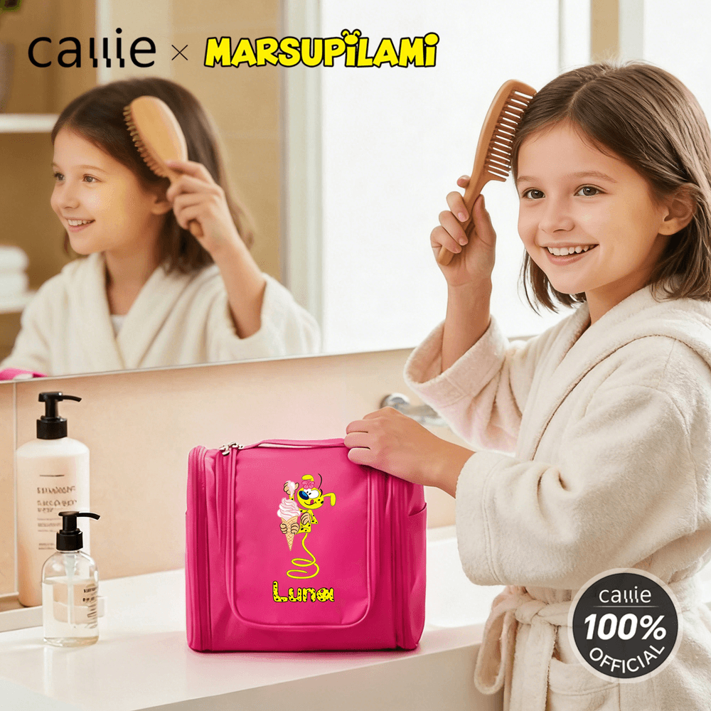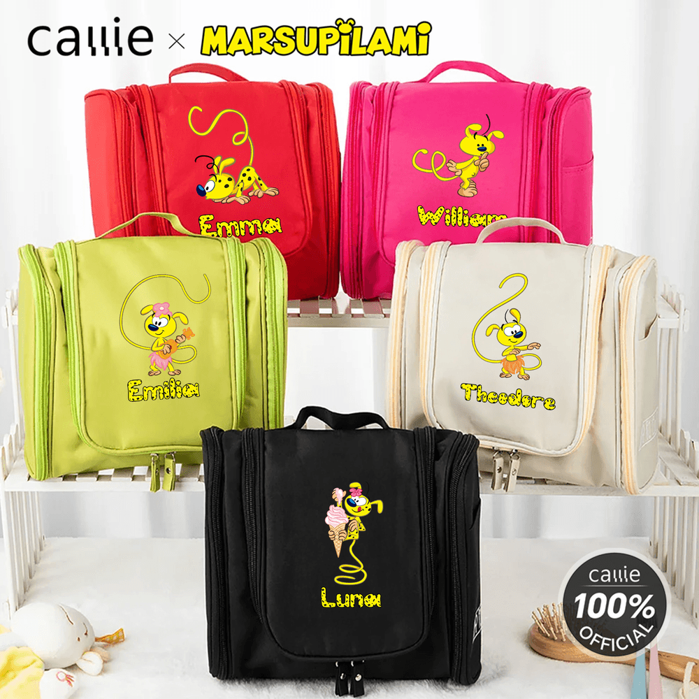 Belgialaisen sarjakuvapiirtäjän André Franquinin vuonna 1952 luoma Marsupilami on viidakon asukki, jolla on keltainen turkki, mustia täpliä ja erittäin joustava, pitkä häntä. Paremman muotoiluvaikutelman aikaansaamiseksi tässä toalettilaukussa on 7 värivaihtoehtoa, ja sen voi räätälöidä yksilöllisellä nimellä, mikä tekee jokaisesta laukusta ainutlaatuisen ja rohkaisee lapsia ilmaisemaan yksilöllisyyttään luottavaisesti.