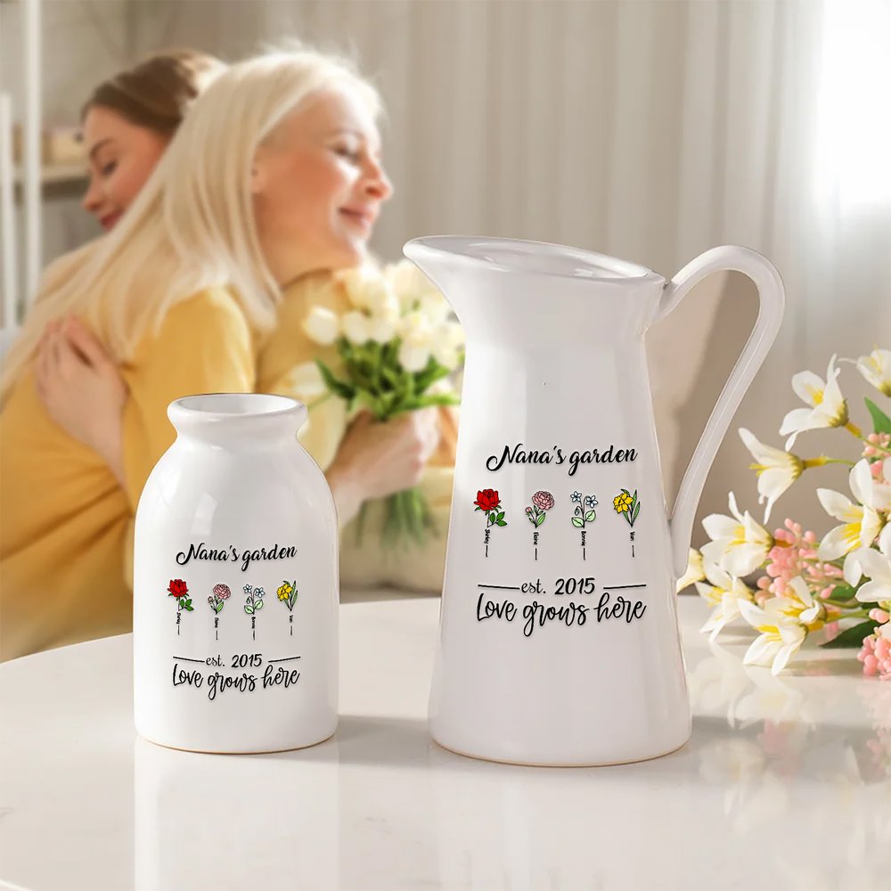 Tämän maljakon muotoilu on lämmin ja merkityksellinen. Se on teemoitettu "puutarha". Yläosaan voidaan räätälöidä nimiä, kuten "Äiti" ja "Isoäiti". Pulloon voidaan räätälöidä 1-12 hienoa syntymäkukkakuviota ja perheenjäsenten nimet. Maljakkoon on myös painettu sanat "Rakkaus kasvaa täällä", jotka symboloivat perheen lämpöä ja kiintymyksen vaalimista.