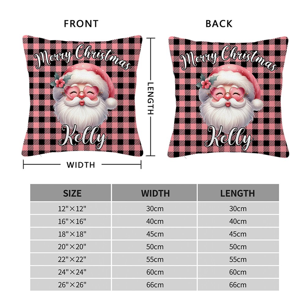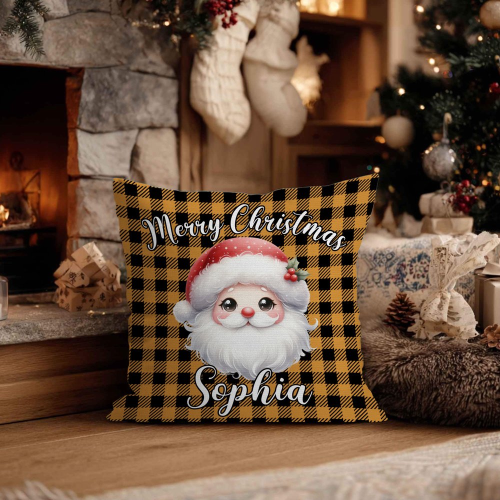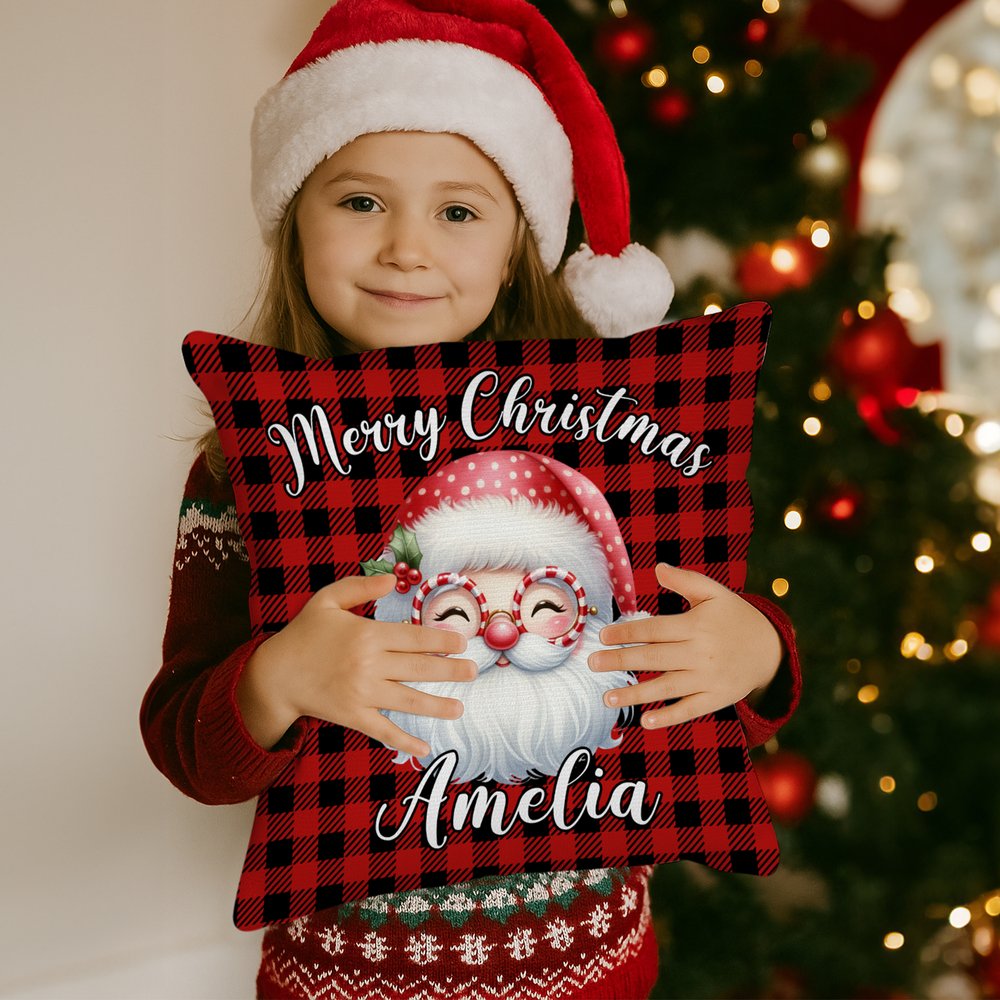 Tässä jouluaiheisessa tyynyssä on söpöjä sarjakuvamaisia joulupukin kuvia, "Hyvää joulua" -tervehdys ja muokattavissa olevat nimet. Se on täynnä voimakasta joulutunnelmaa, jossa yhdistyvät loma-ajan sisustusviehätys ja lämmin, eksklusiivinen kosketus personoinnin kautta.