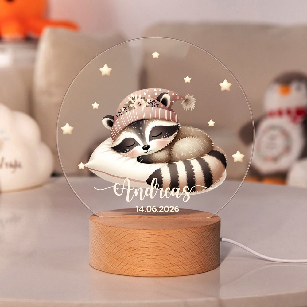 Tässä yövalaisimessa on ihastuttava kuva sarjakuvaeläimestä, joka nukkuu rauhallisesti kuun päällä tuikkivien tähtien ympäröimänä, mikä luo unenomaisen ja lämpimän tunnelman. Tarjoamme 19 erilaista eläinmallia, ja voit mukauttaa lapsen nimen ja syntymäajan, jolloin jokainen yövalo on ainutlaatuinen taideteos täynnä hauskuutta ja persoonallisuutta, joka sopii täydellisesti mihin tahansa lastenhuoneeseen.