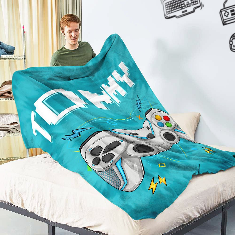 Tässä huovassa on solmiovärjätty tausta ja keskelle painettu gamepad-kuvio, jota elävöittävät kahvan ympärillä olevat salamat. Voit myös mukauttaa huovan nimen, jotta siitä tulisi vieläkin erikoisempi.