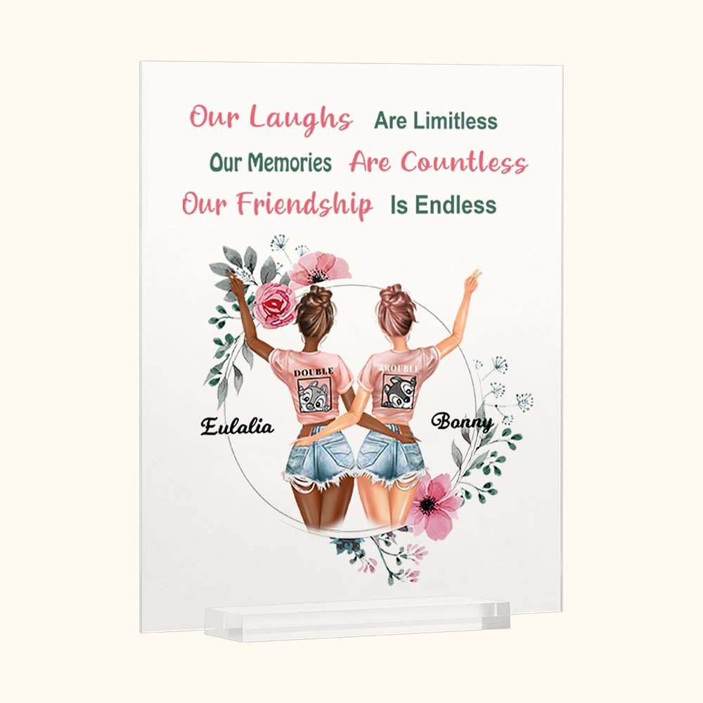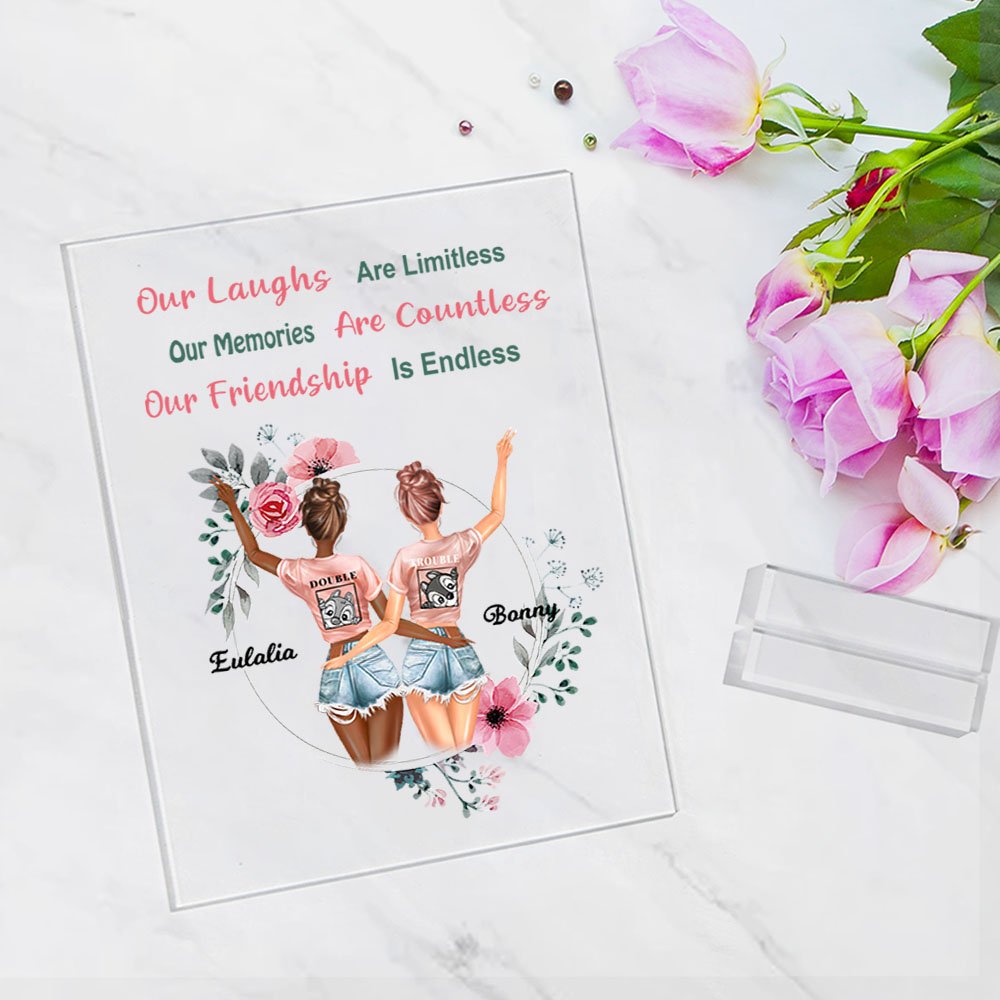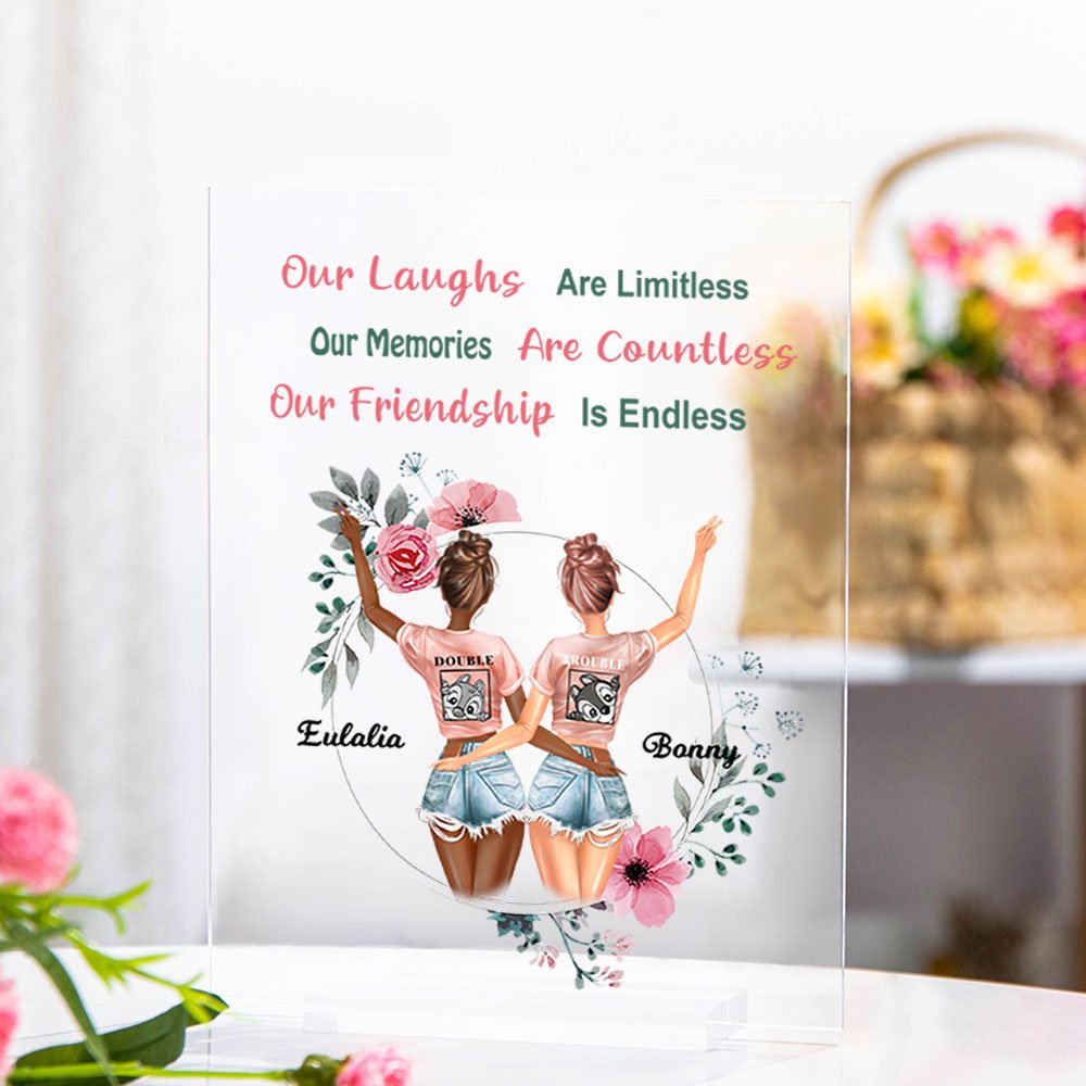 This acrylic plaque is the perfect gift for your best friend as it can be customized with your and your friend's name and appearance, adding a personal touch to the gift.