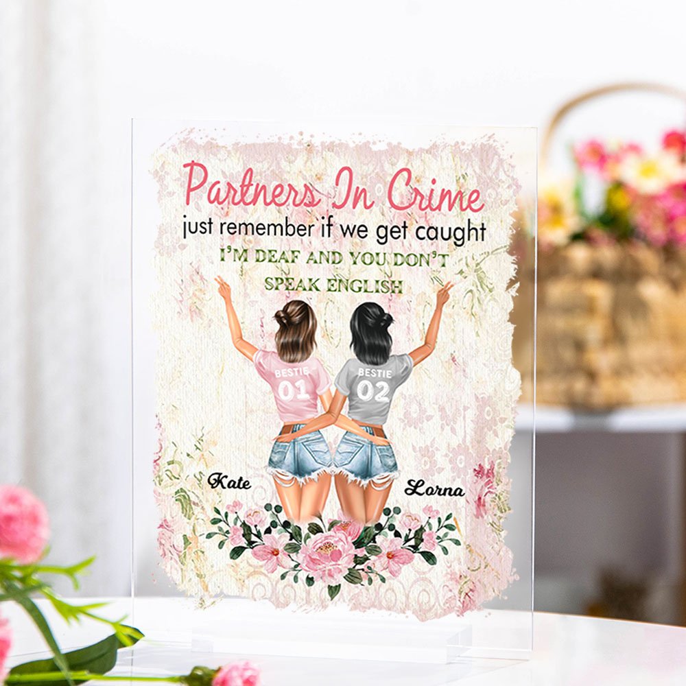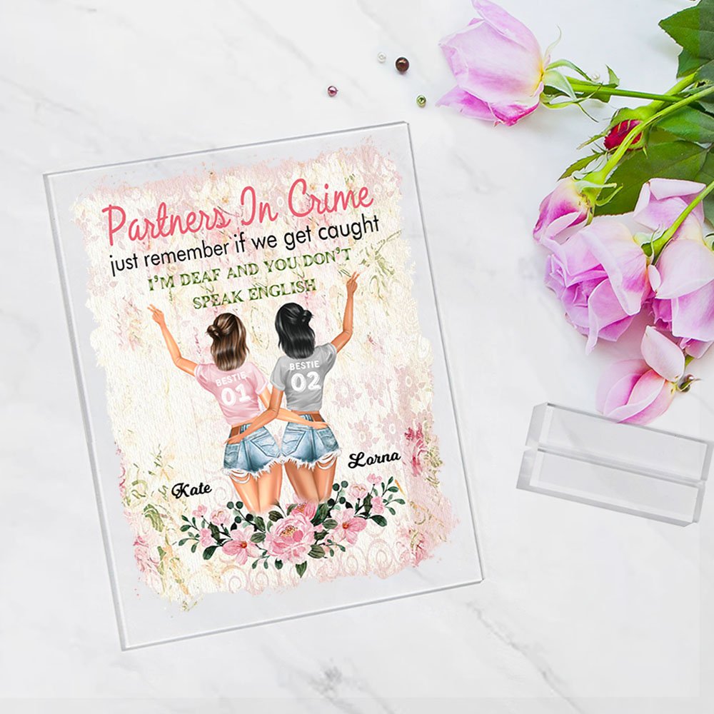 Henkilökohtaiset kukat Rikostoverit Muista vain, jos jäämme kiinni, olen kuuro ja sinä et puhu englantia Akryylilaatta Ystävyys Lahja