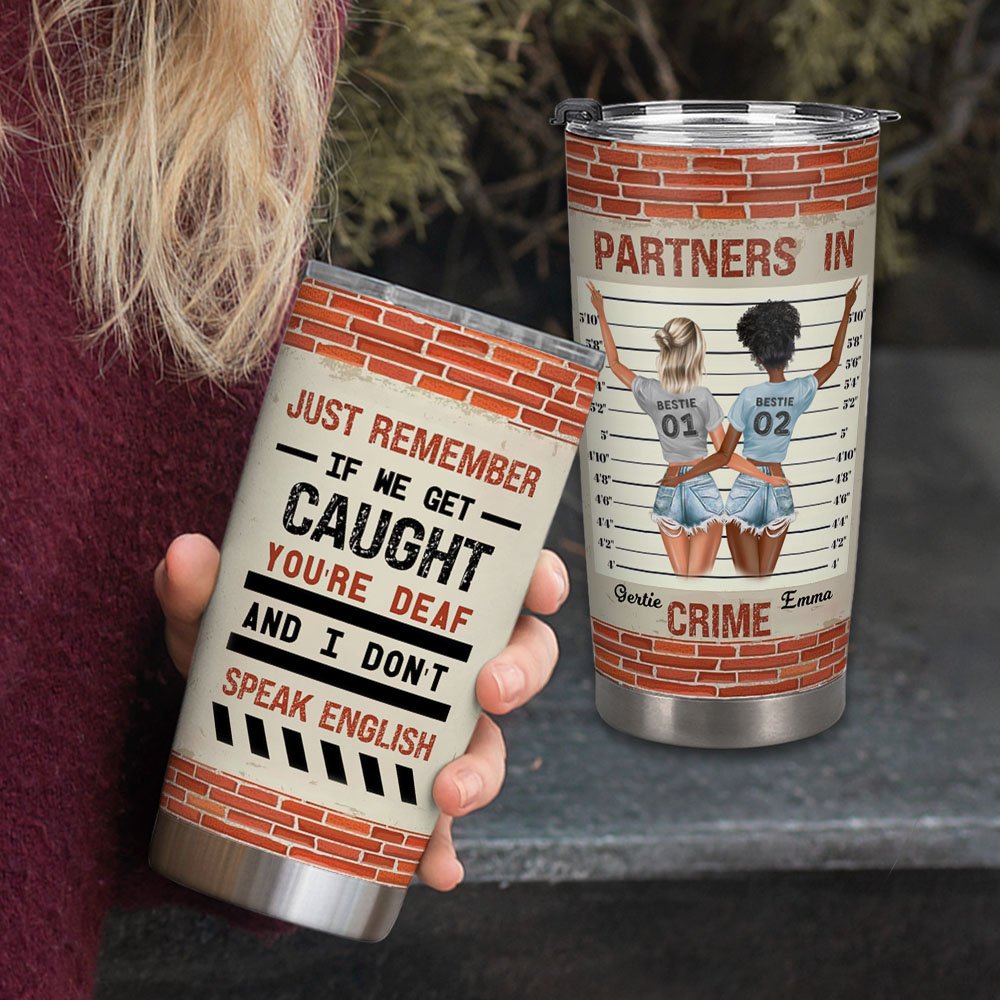 Henkilökohtainen Bestie lainausmerkit Rikostoverit Muista jos jäämme kiinni olet kuuro en puhu englantia 20oz Tumbler Syntymäpäivä kuumille ja kylmille juomille