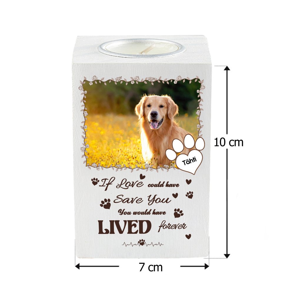 Kynttilänjalaka on henkilökohtaisoitavissa lemmikkikuvalla keskustassa, jota ympäröi kaunisti kuvioitu reunus ja tassujäljet. Lisää lemmikkisi nimi ja oma teksti. Anna jokaisen muotoilun kantaa ainutlaatuista muistoa ja tulla henkilökohtaiseksi symboliksi teidän ja lemmikkinne välisestä läheisestä sidoksesta.