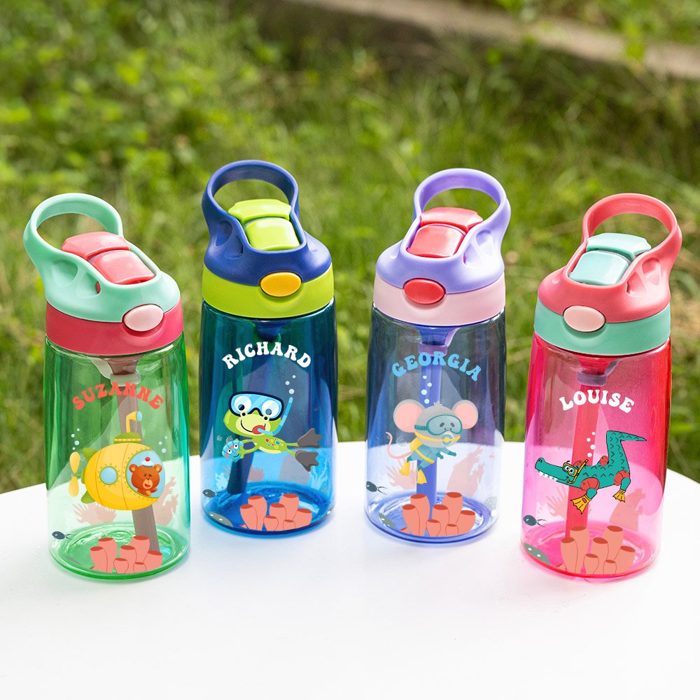 Vedenalaisen maailman innoittamana tämä vesipullo esittelee värikkäitä eläimiä, kuten söpöjä kaneja, vilkkaita rottia ja salaperäisiä apinoita. Läpinäkyvän pullon ansiosta voit nähdä veden vaihtelun aivan kuin katselisit lempieläintäsi sukeltamassa ja tutkimassa. Jokainen muotoiluelementti on tarkoitettu innostamaan lapsia tutkimaan vedenalaista elämää. Erityistä on, että voit kustomoida vesipullot lapsesi nimellä, jolloin jokaisesta tulee ainutlaatuinen ja henkilökohtainen.