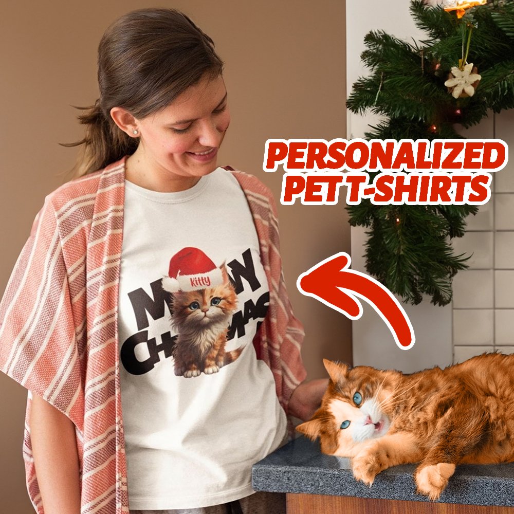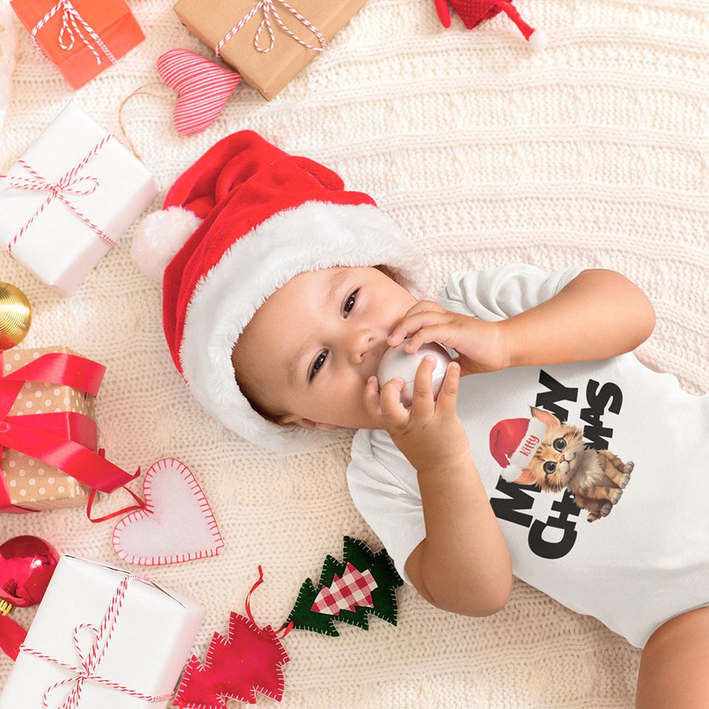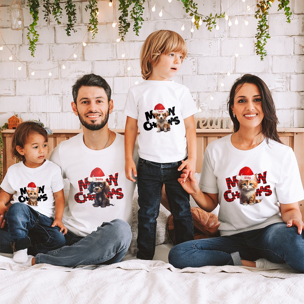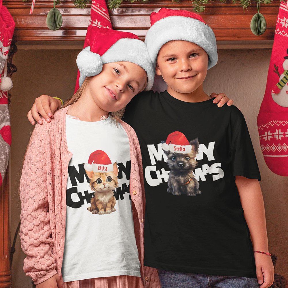 Tässä vaatteessa on ainutlaatuinen ja leikkisä muotoilu, joka kuvastaa lomakauden olemusta. T-paidan ja untuvapuvun etupuolella on viehättävä kissa, jolla on joulupukin hattu, ja siihen liittyy hauskalla ja juhlavalla fontilla kirjoitettu teksti "Meowy Christmas". Joulupukin hattu tuo suloisen säväyksen, joka viimeistelee ulkoasun ja levittää iloa kaikkialle.