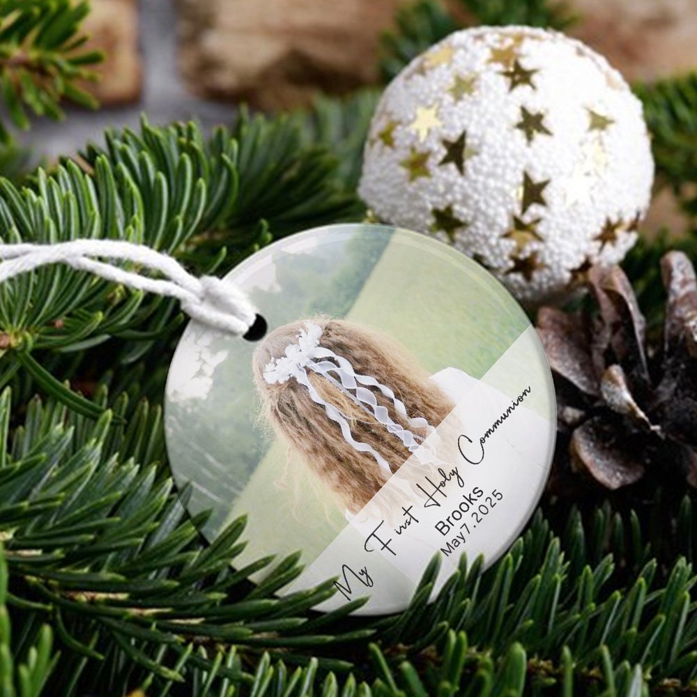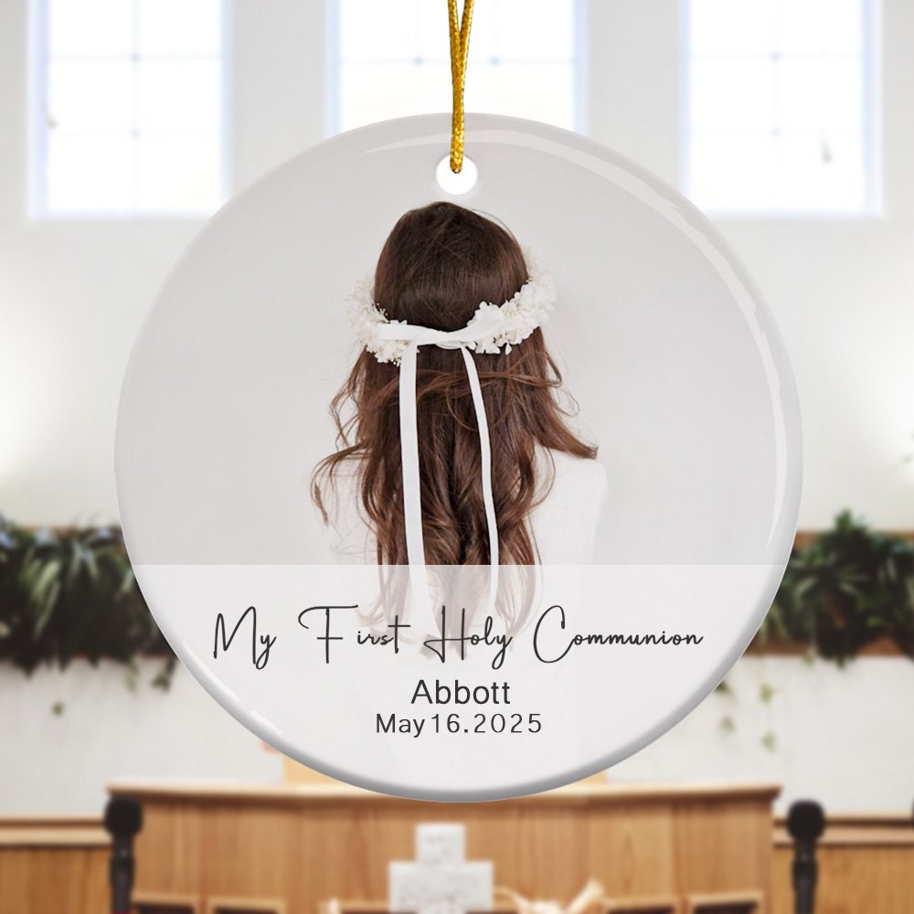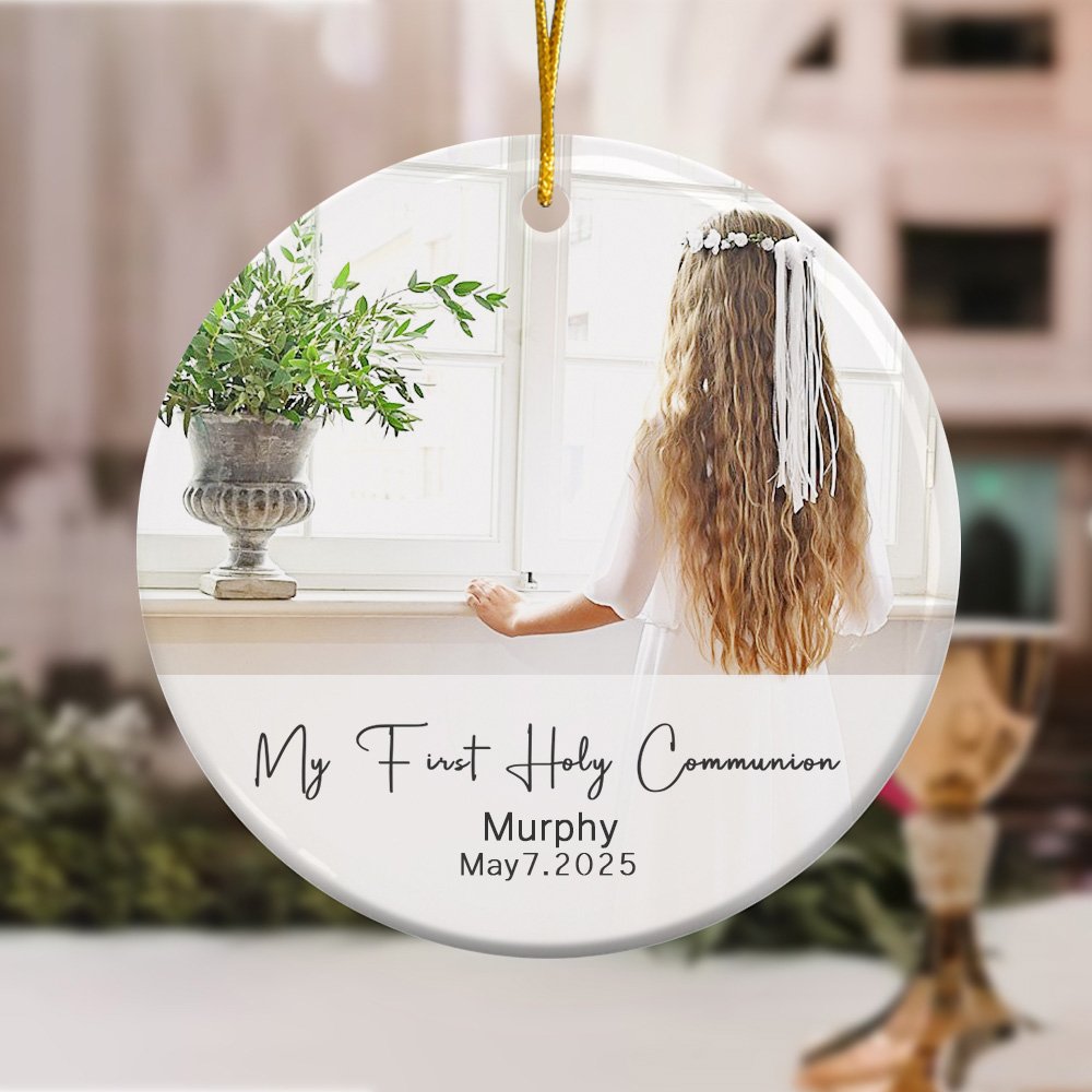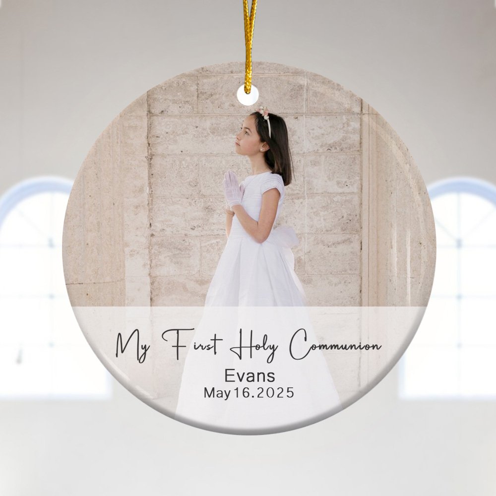 Tämä koriste voidaan räätälöidä valokuvasi mukaan, tämä koriste on kauniisti muotoiltu, ja siinä on sanat "Ensimmäinen pyhä ehtoollinen", ja se voidaan myös tulostaa nimellä ja päivämäärällä, joka on kirjaa ensimmäisestä ehtoollisestasi.
