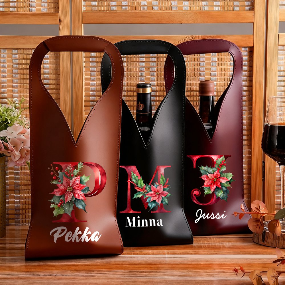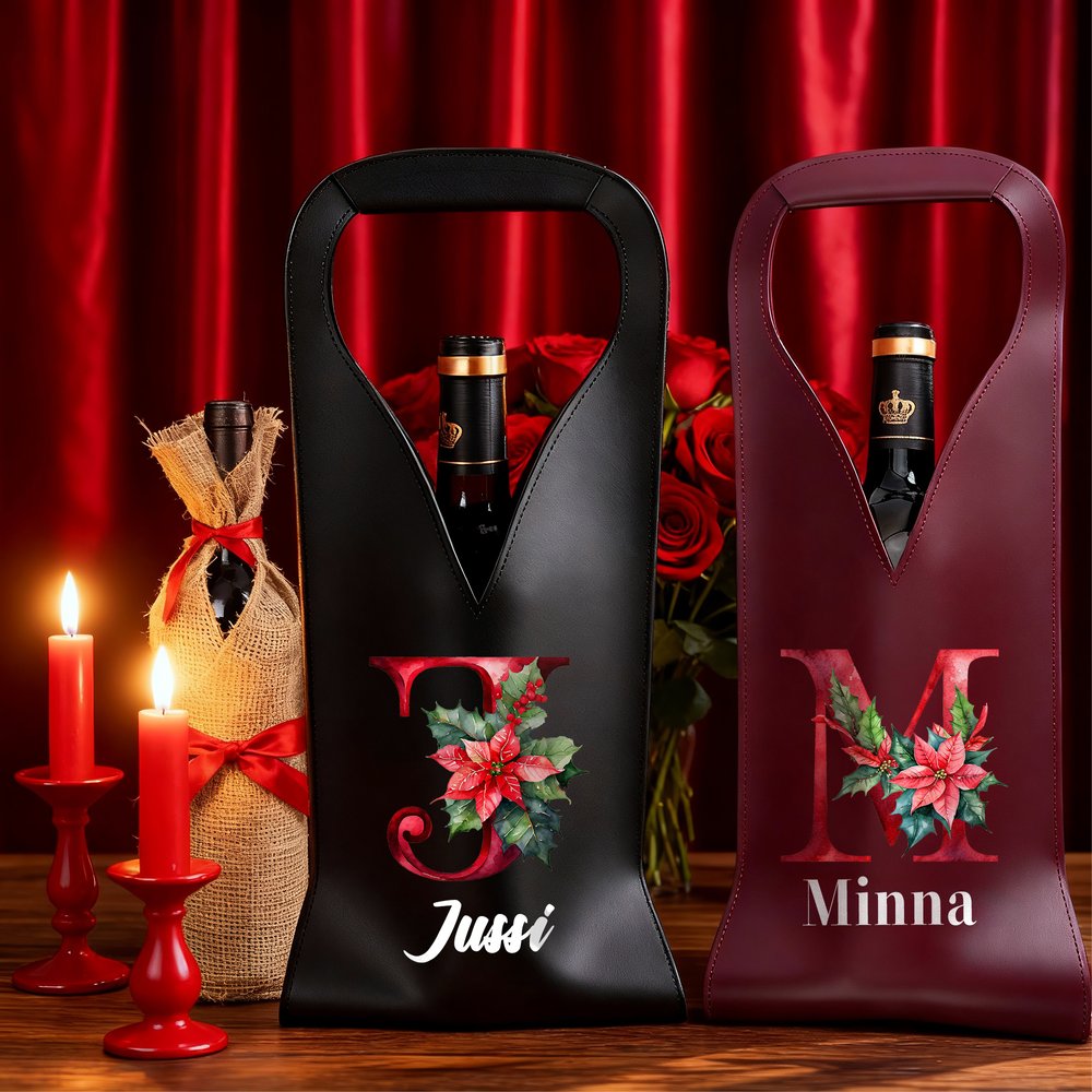 Voit valita värin seuraavista vaihtoehdoista: punainen, viininpunainen, musta, ruskea ja vaaleanruskea. Valitse alkukirjain A-Z ja syötä nimi. Muotoilussa on kukka-aihe, kuten joulutähti ja joulupukin lehdet, jotka tuovat juhlallisuutta ja tekevät jokaisesta laukusta ainutlaatuisen lisävarusteen, joka heijastaa tyyliäsi tai vastaanottajan persoonallisuutta.