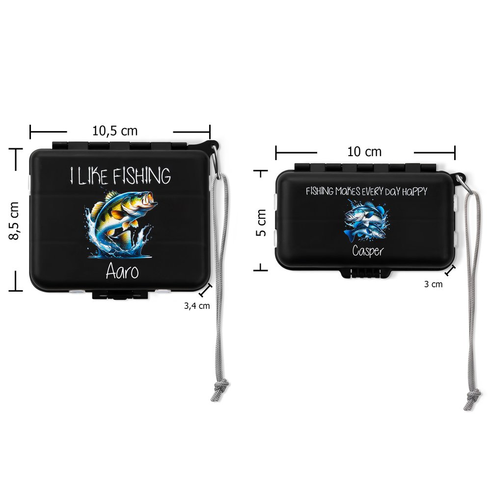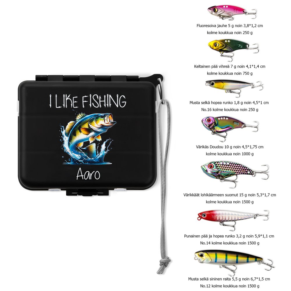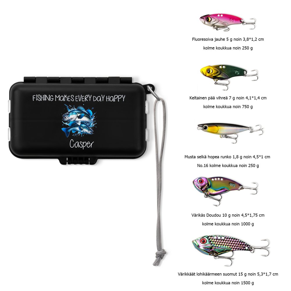 Personoitu kannettava kalastuslaatikko jossa on aidon näköiset vieheet täydellinen isänpäivälahja kalastuksen harrastajille