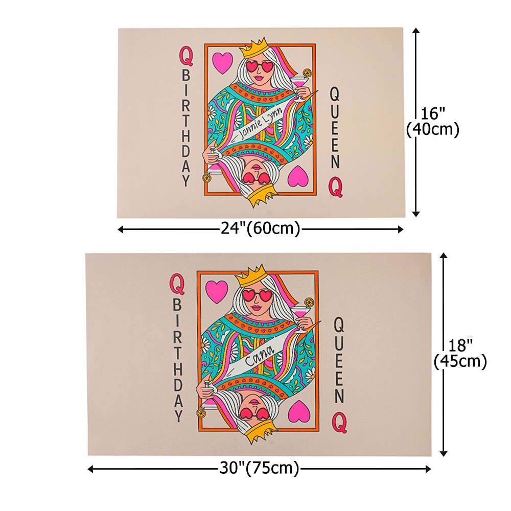 Tämä matto on saanut inspiraationsa pelikorttien herttakuningattaresta, ja siinä on syntymäpäiväelementtejä, jotka luovat tyylikkään kuningattaren kuvan. Kruunun, aurinkolasien ja cocktailin yhdistelmä lisää leikkisää eleganssia ja yhdistää klassiset pelikorttielementit ja syntymäpäivätoivotukset ainutlaatuiseen ja huomiota herättävään tyyliin.