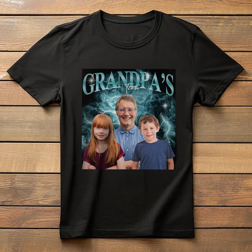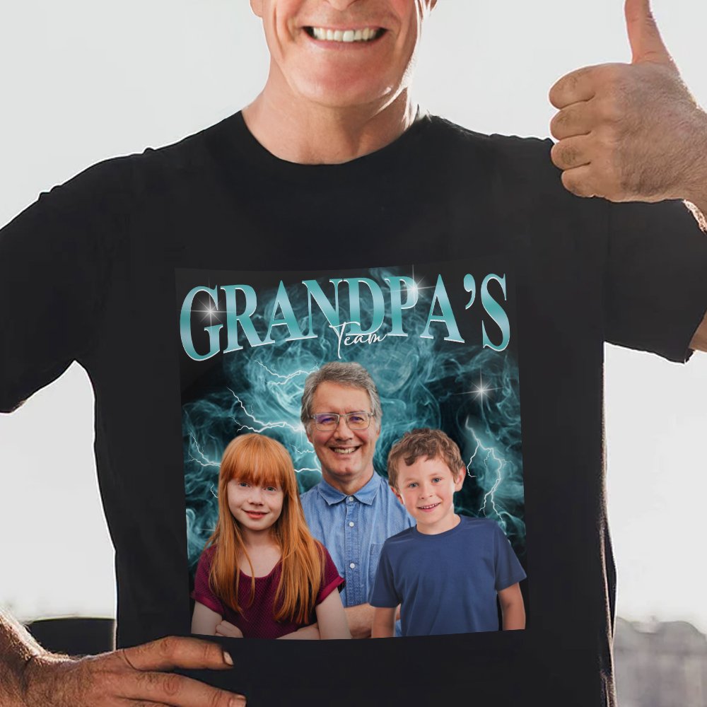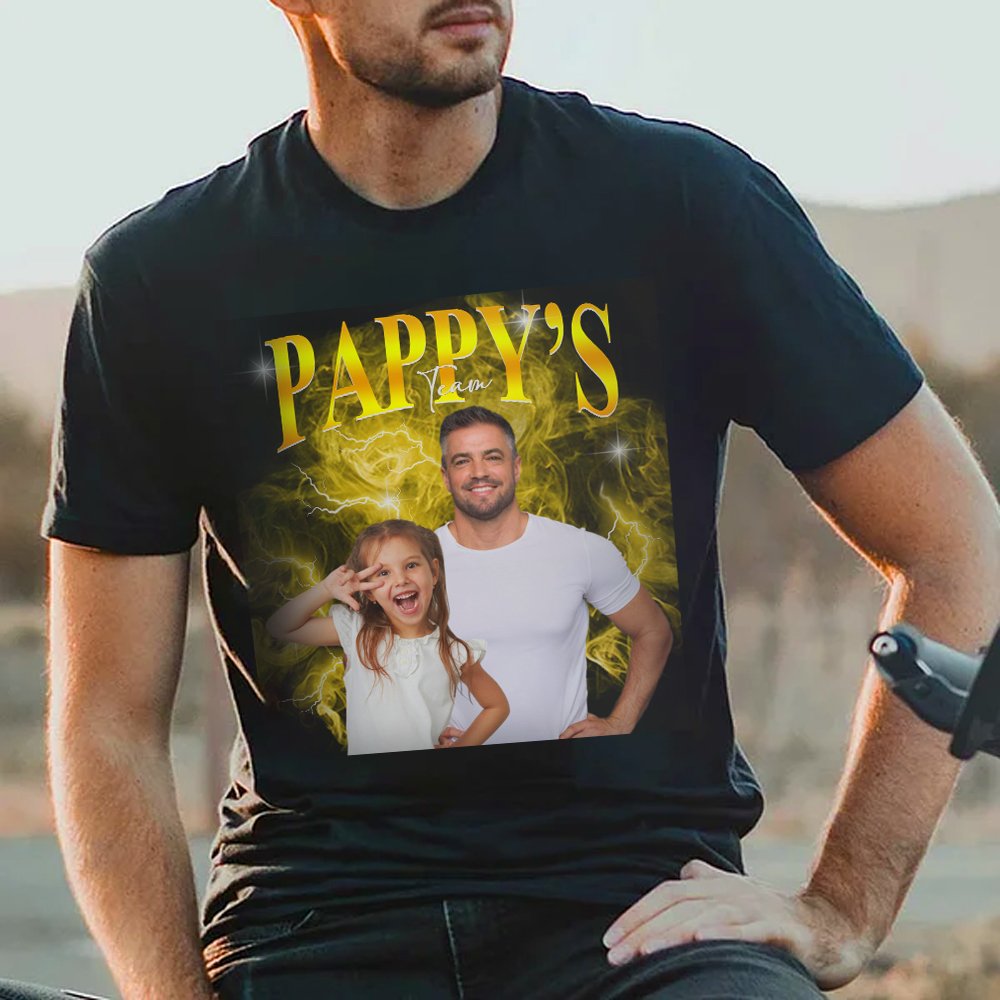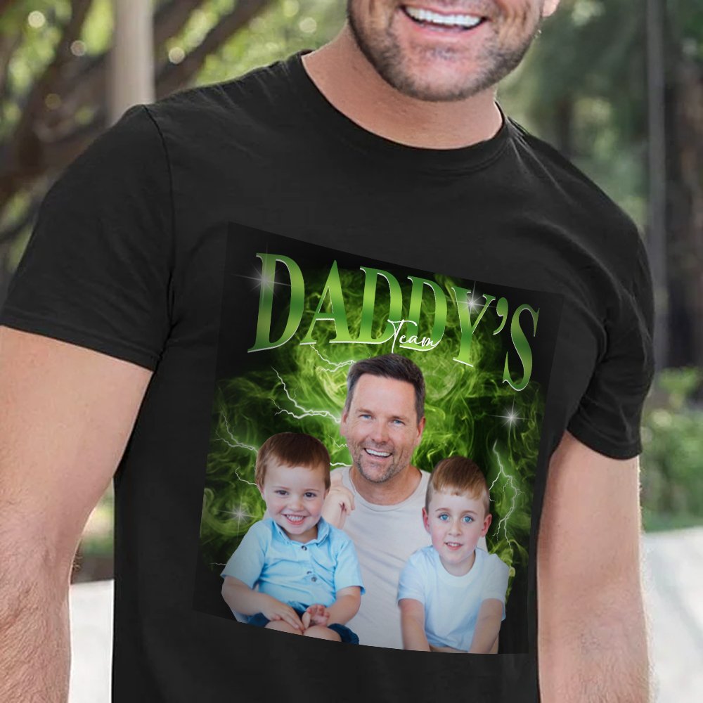 T-paitojen päätyylinä on retrohenkinen hiphop-tyyli, jonka taustalla on savua ja salamoita. Voit ladata 1-5 valokuvaa lapsistasi lasten lukumäärän mukaan ja lisätä nimesi osoittaaksesi läheisen yhteyden sinun ja lastesi välillä.