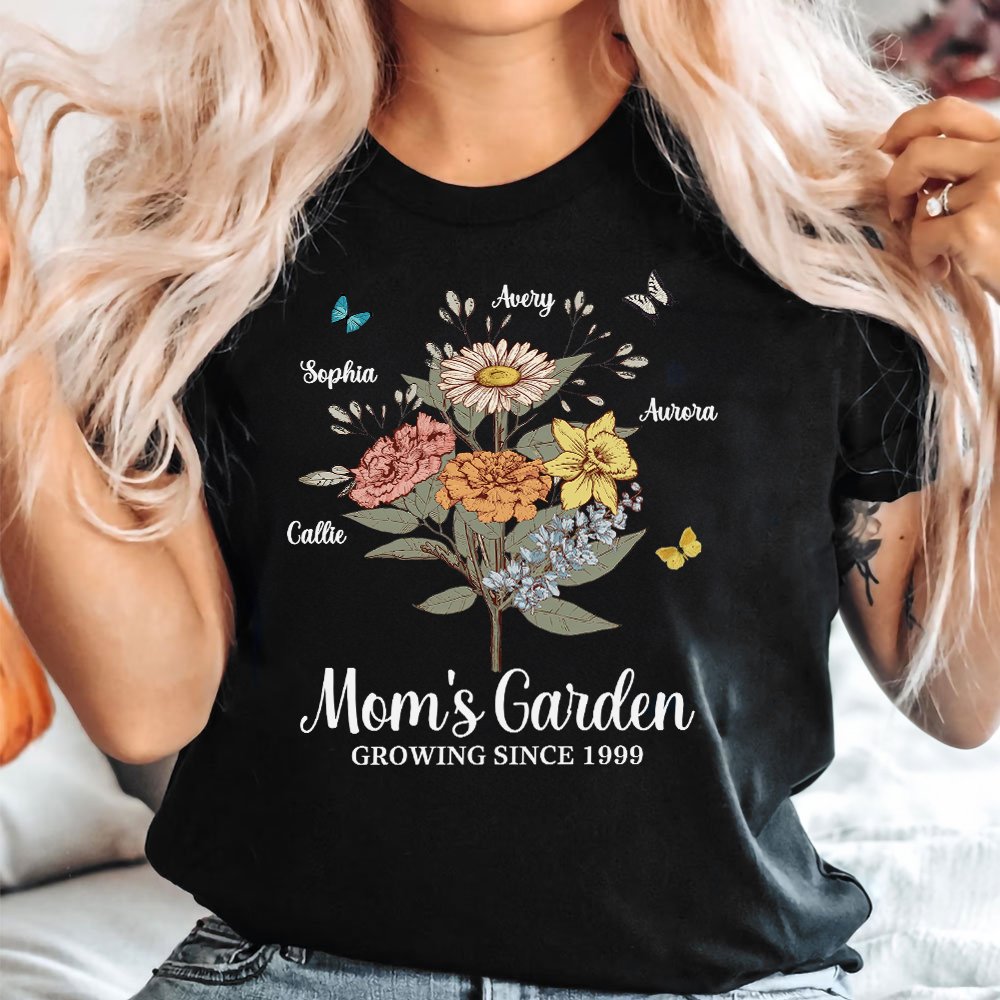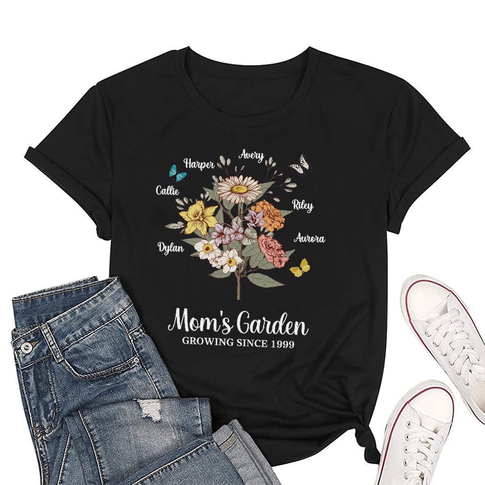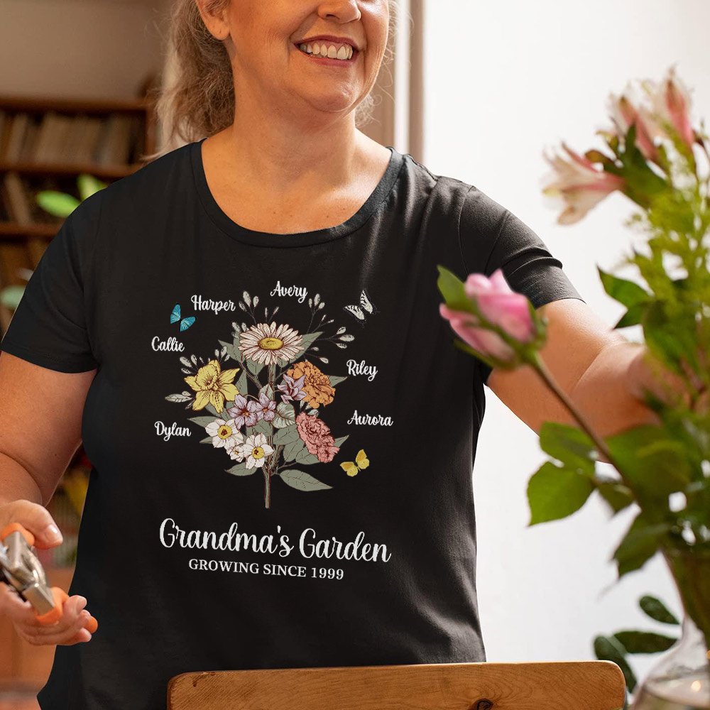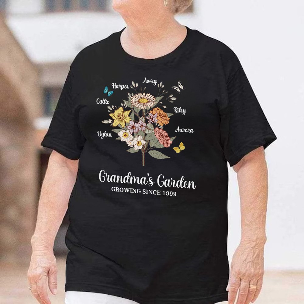 The front of the shirt can be customized with 1-10 kid names and corresponding birth flowers, forming a flower bouquet or row that perfectly expresses the love and admiration you have for your mother or grandmother.