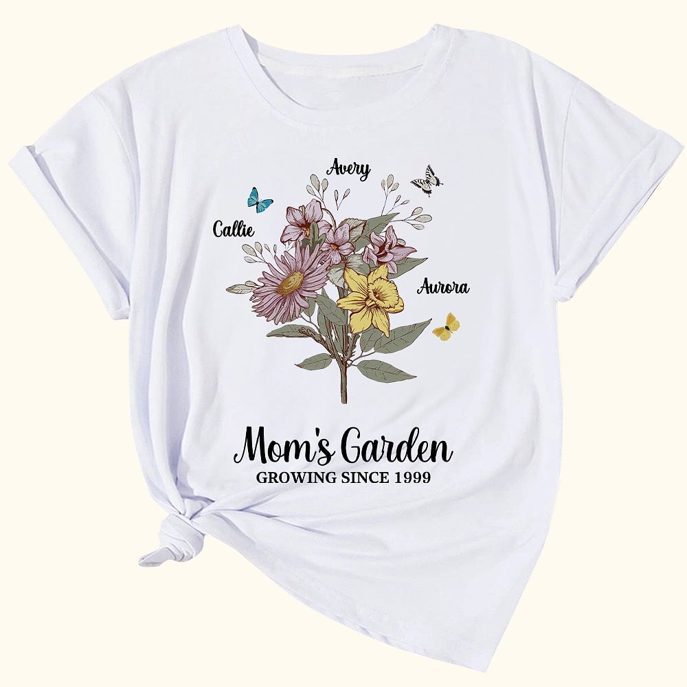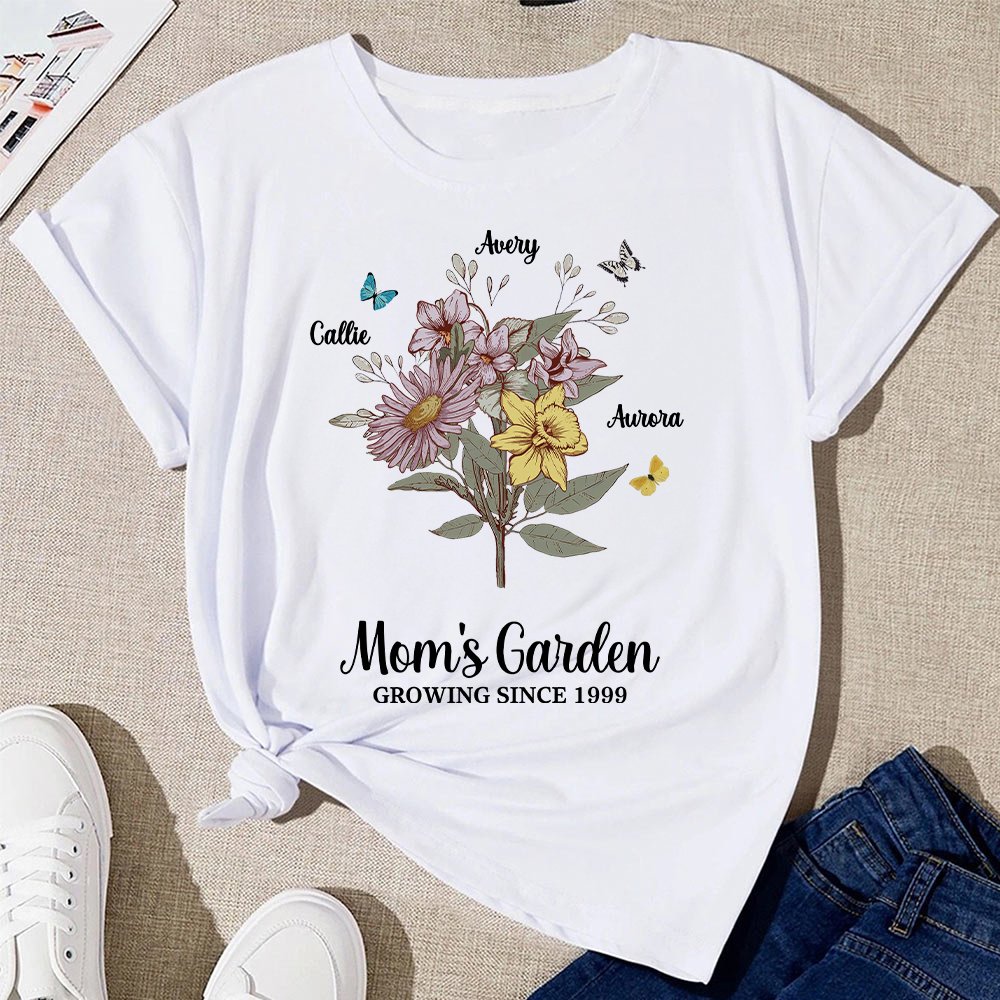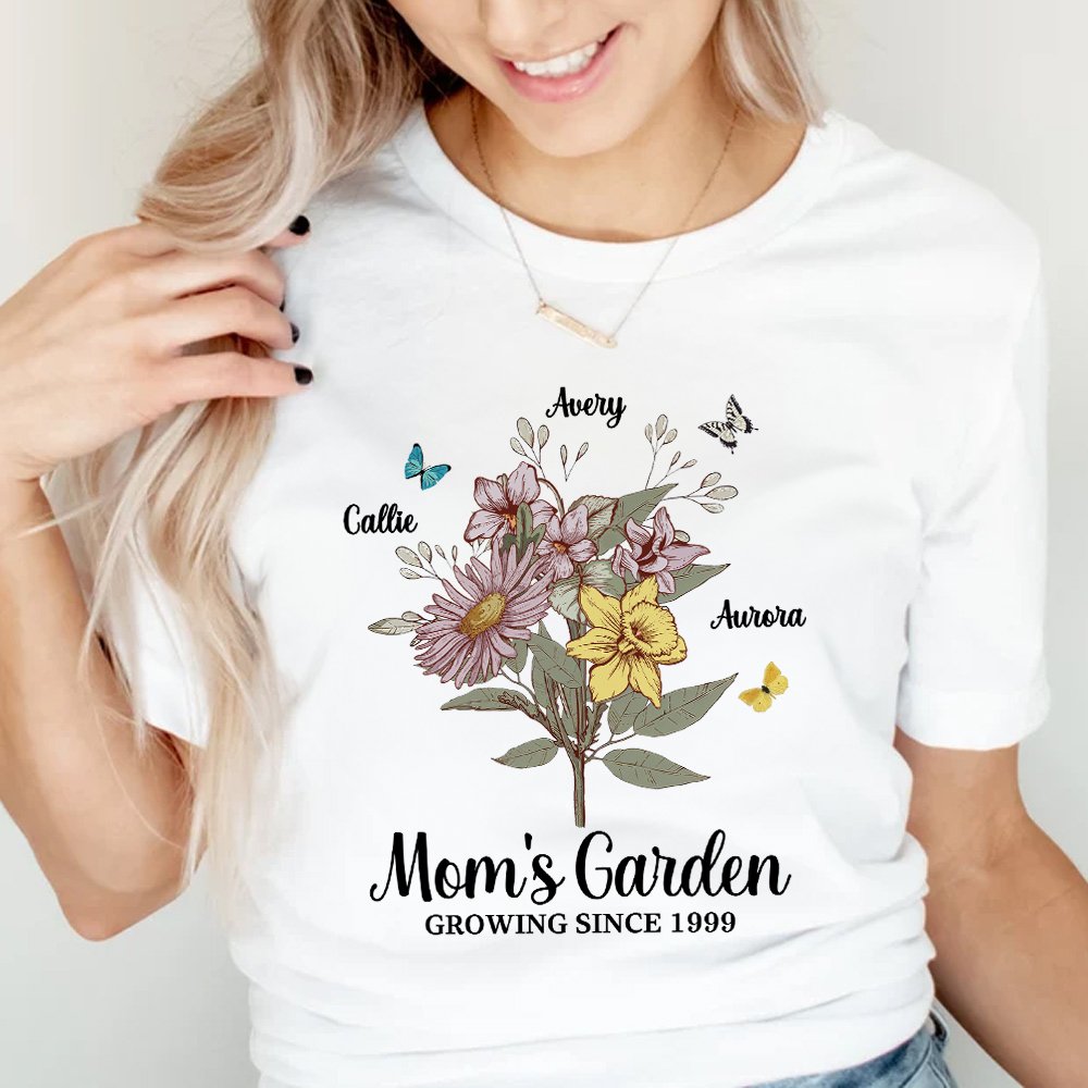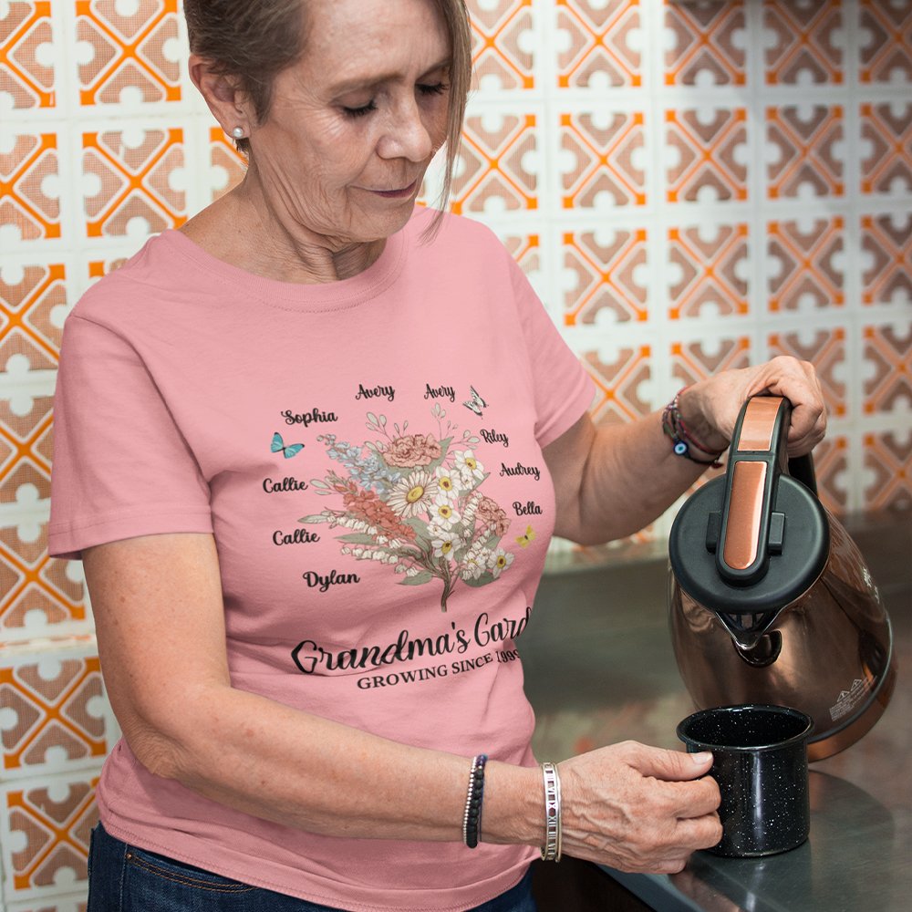 The front of the shirt can be customized with 1-10 kid names and corresponding birth flowers, forming a flower bouquet or row that perfectly expresses the love and admiration you have for your mother or grandmother.