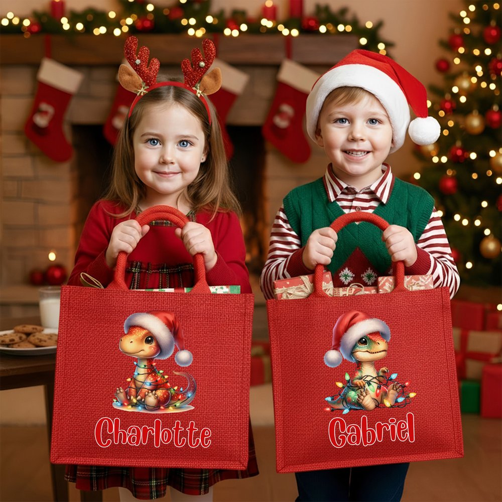 Henkilökohtainen Santa hattu dinosaurus lyhdyt suuri kapasiteetti punainen Juutti Kangaskassi nimi joulu festivaali puolue lahja lapsille