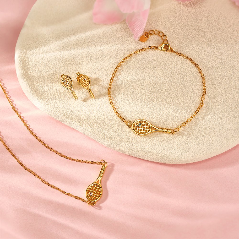 Älä missaa tätä tennisaiheista korusettiä! Olitpa sitten viikonloppuisin tennistä rakastava äiti, tennisfanaatikko tyttöystävä tai läheinen ystävä, joka ei koskaan jätä väliin Grand Slam -turnausta, tämä korusetti lumoaa heidät kaikki. Täydellinen syntymäpäiville, merkkipäiville tai erikoislahjaksi suuren voiton jälkeen, siinä yhdistyvät tyyli, tunne ja yhteinen rakkaus tennikseen.
